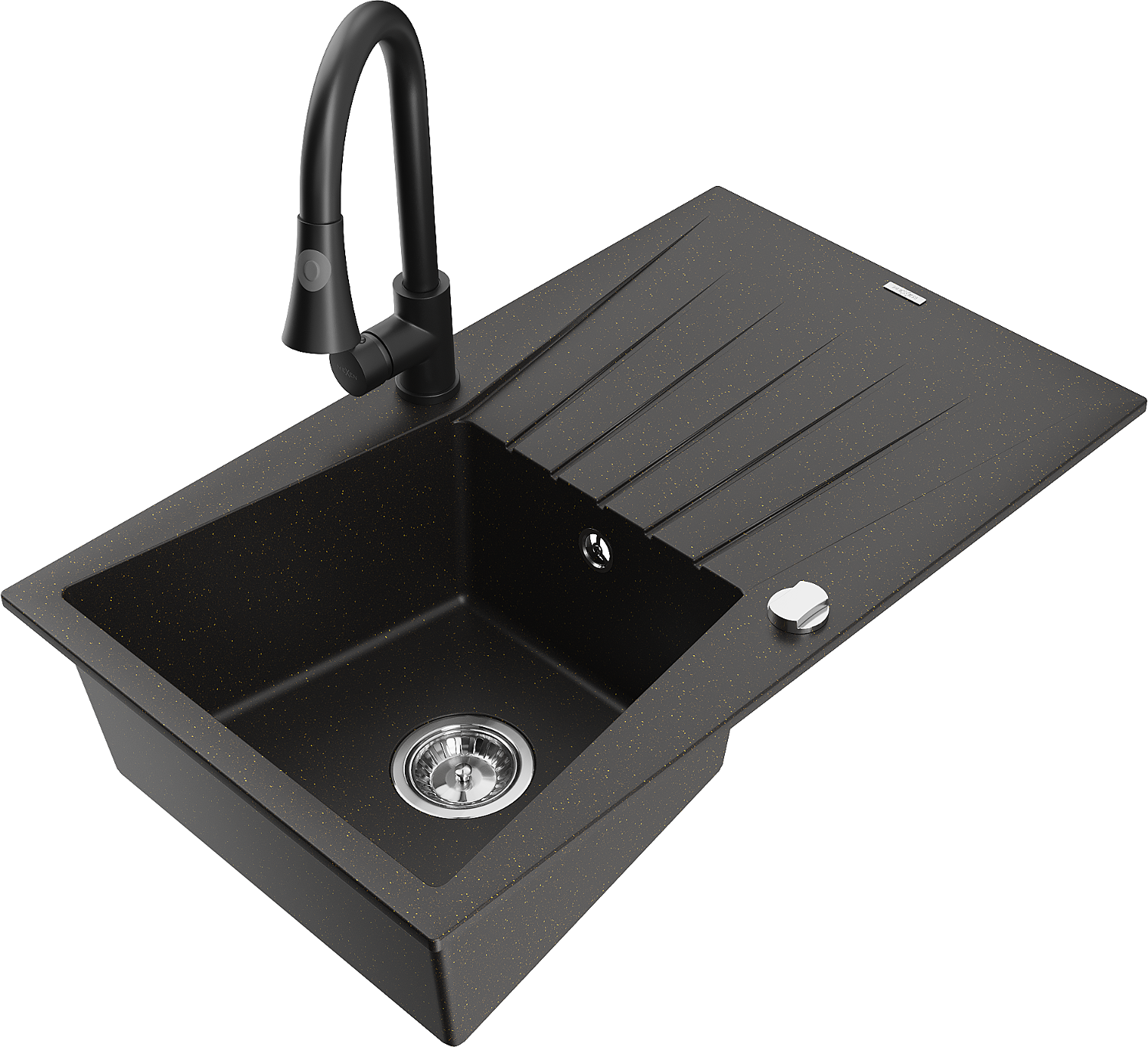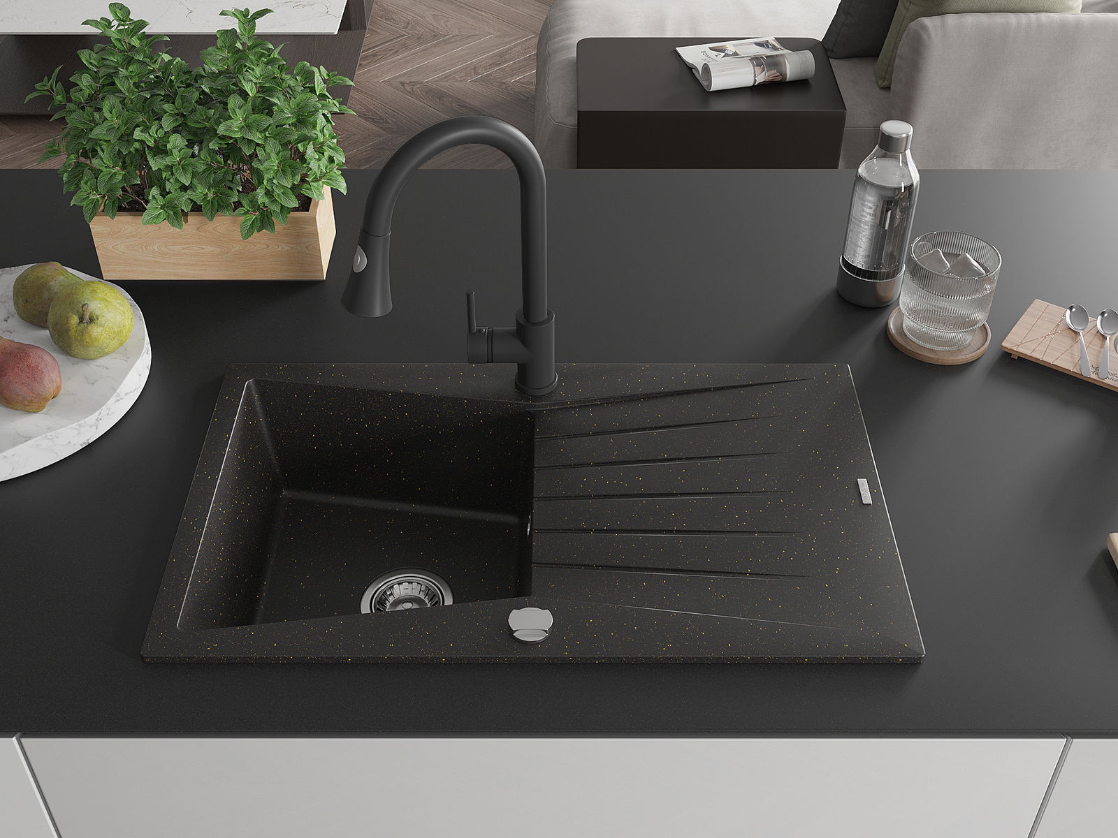 Mexen Cesar évier en granit 1 bac avec égouttoir et robinet de cuisine Elia, noir/or métallique - 6514-75-670101-70