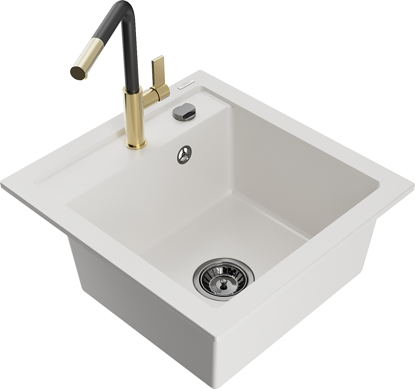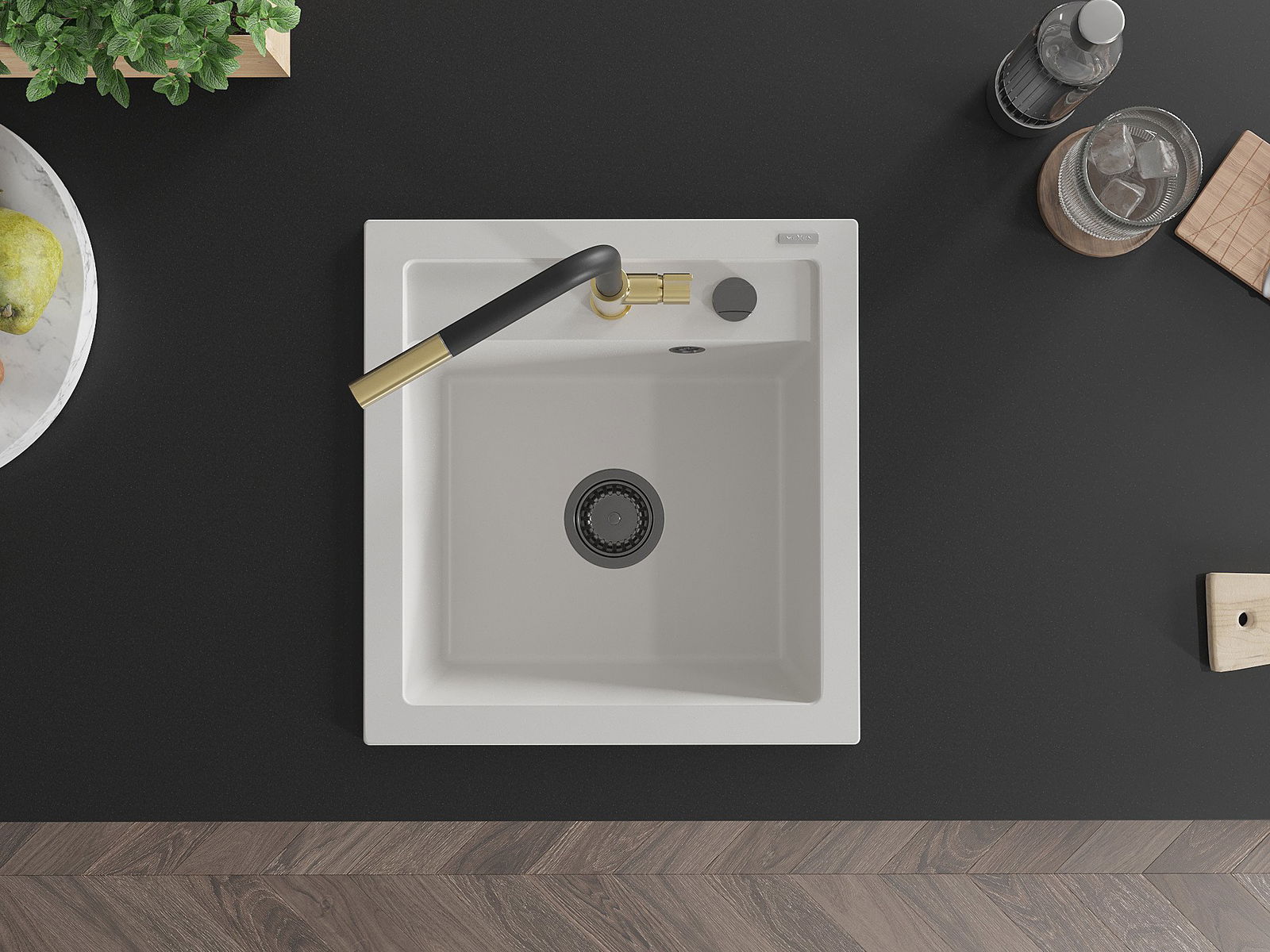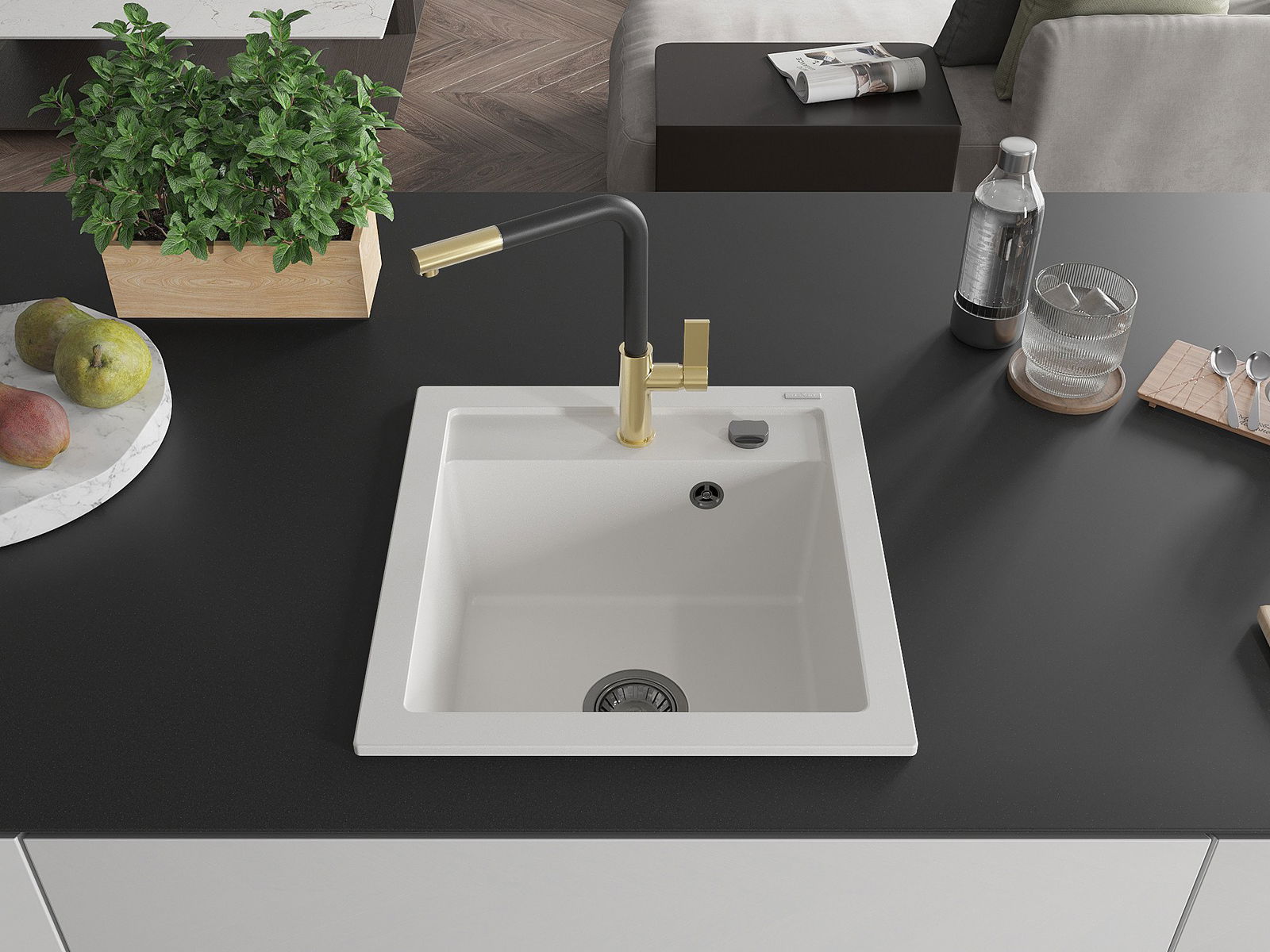 Mexen Vito évier en granit à 1 cuve avec robinet de cuisine Flora, blanc - 6503-20-670401-57-B