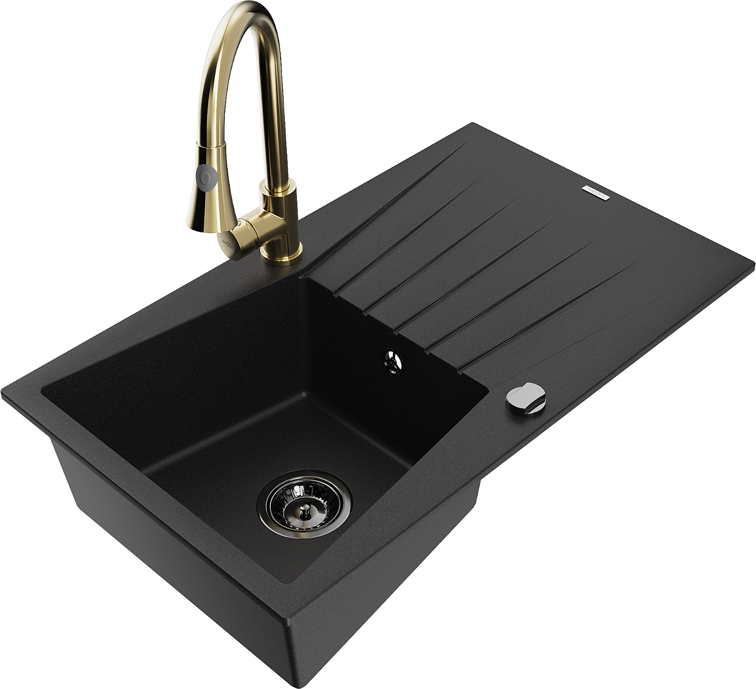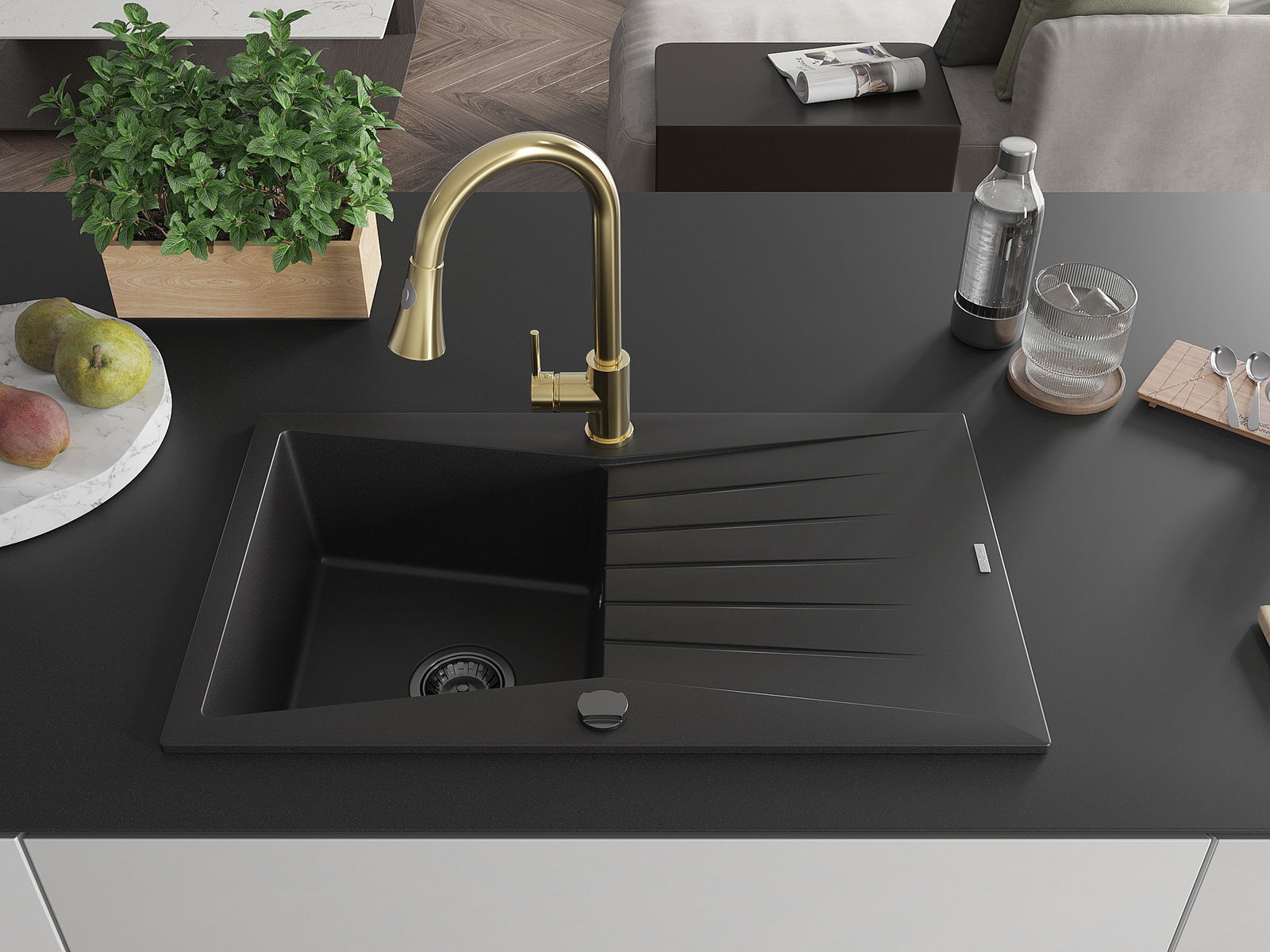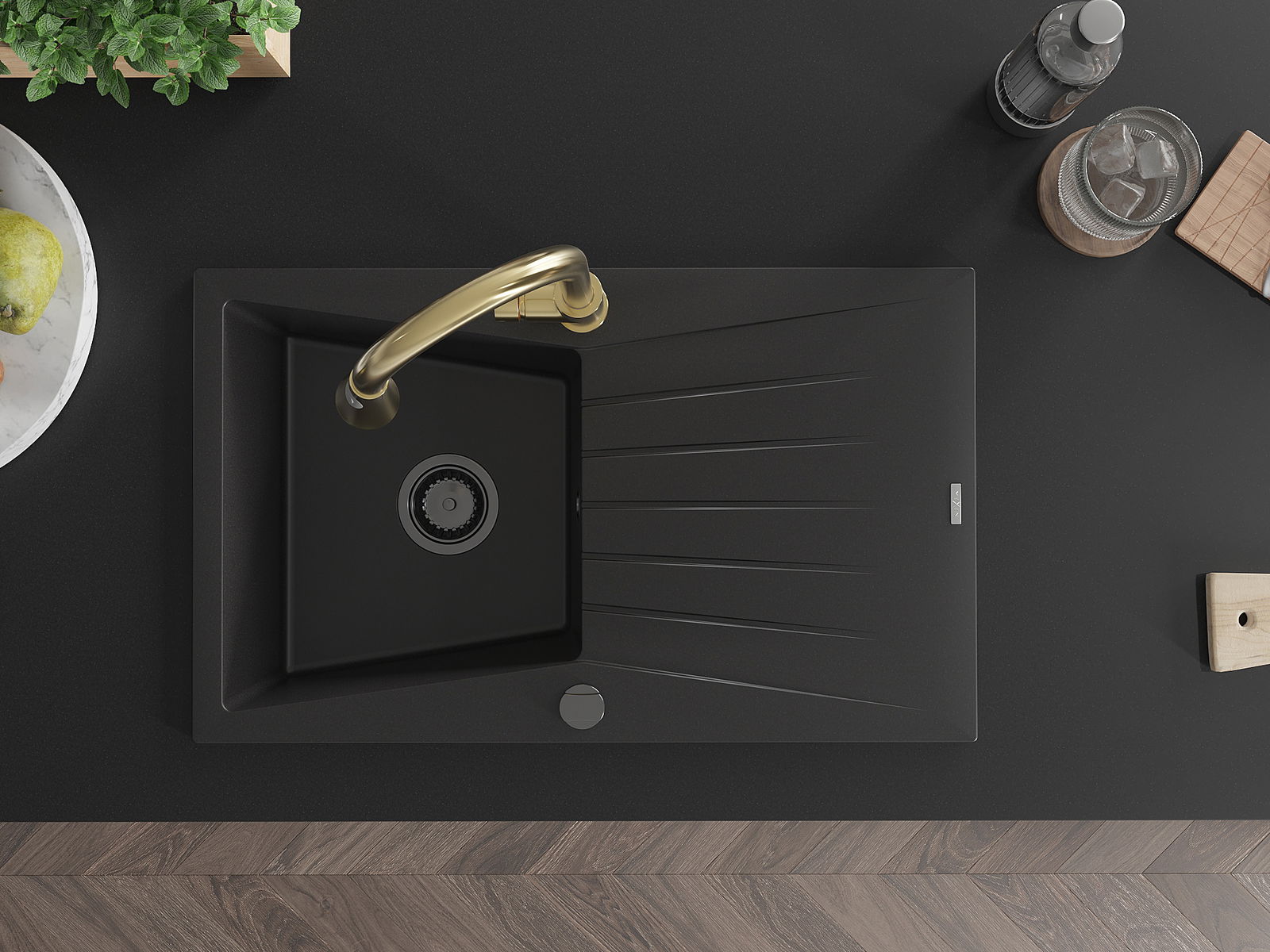 Mexen Cesar évier en granit à 1 bac avec égouttoir et robinet de cuisine Elia, noir - 6514-77-670101-50-B