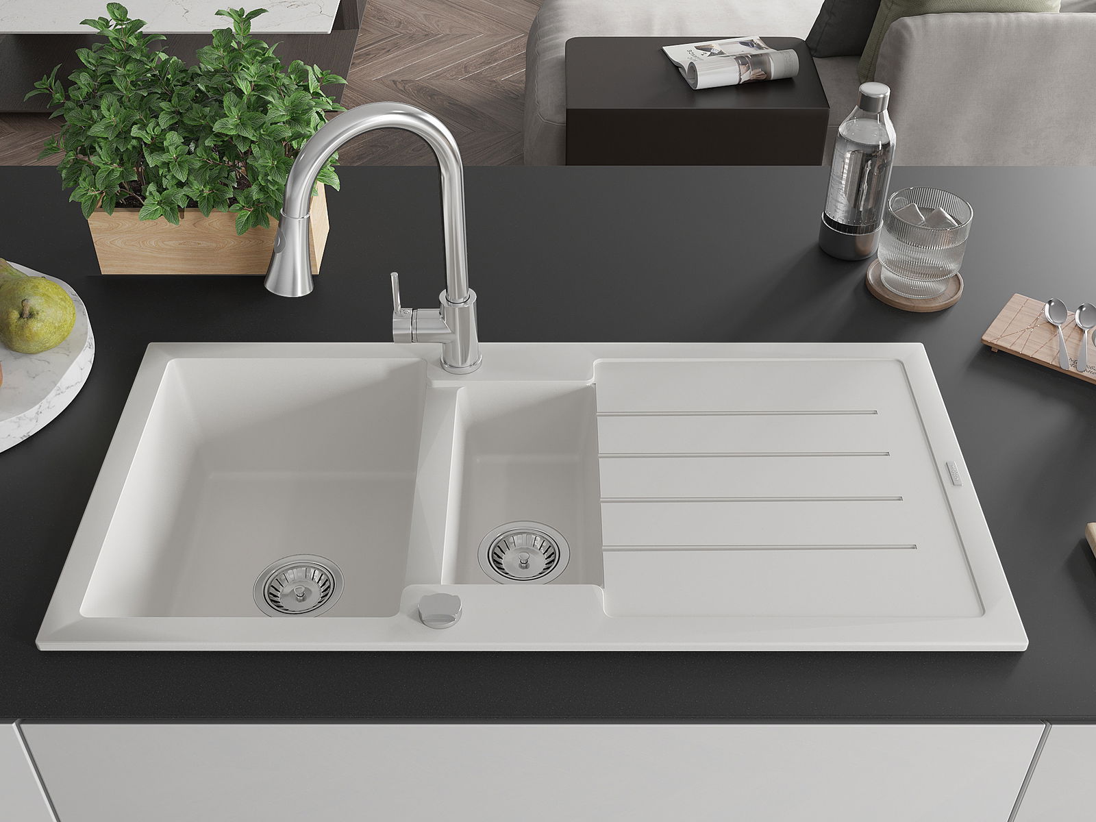 Mexen Andres évier en granit 1,5 bac avec égouttoir et robinet de cuisine Elia, blanc - 6515-20-670101-00