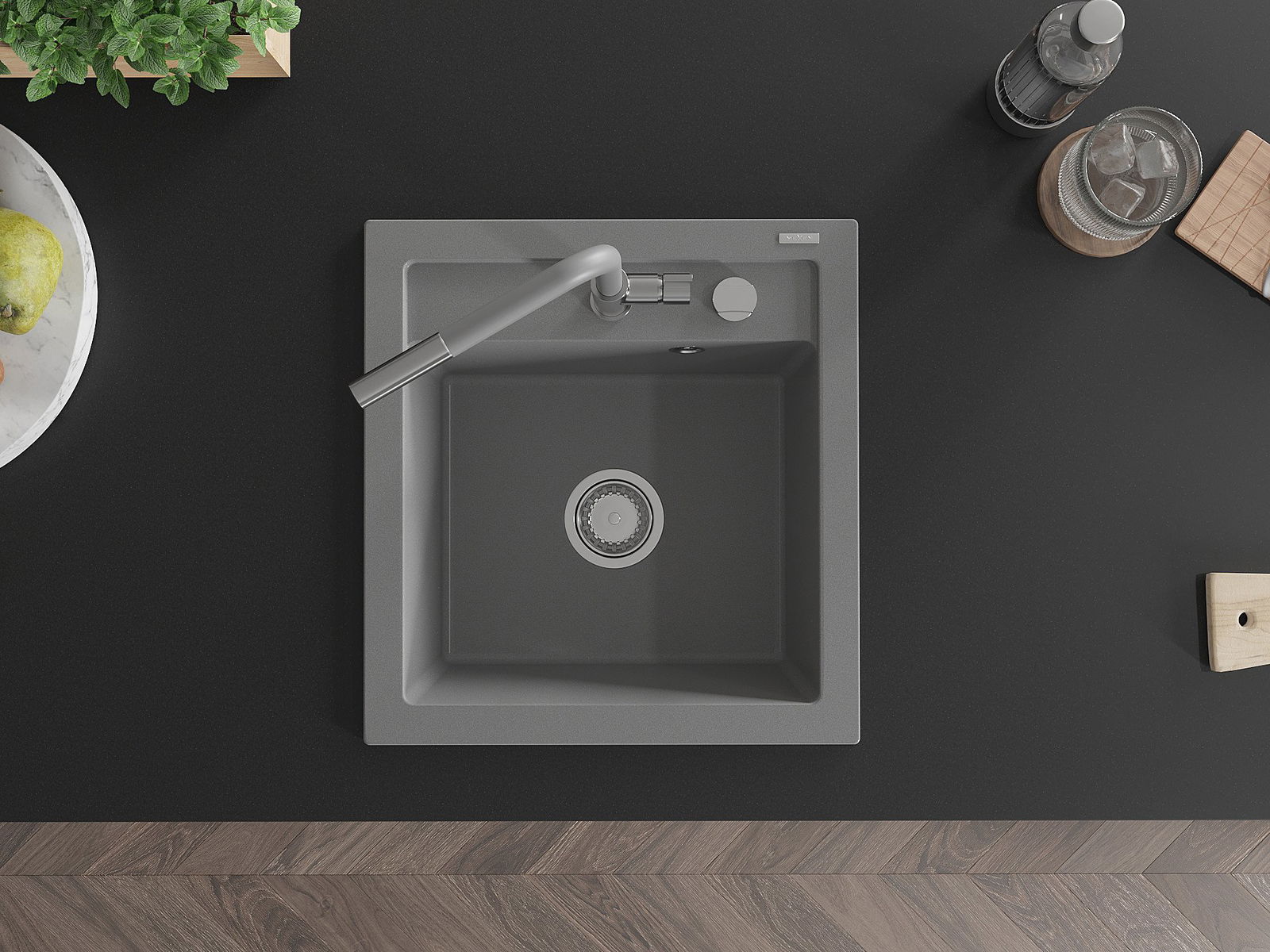 Mexen Vito évier en granit 1 bac avec robinet de cuisine Flora, gris - 6503-71-670401-06