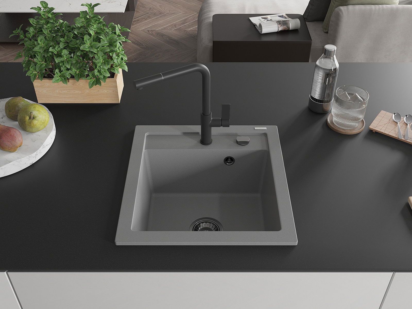 Mexen Vito évier en granit à 1 bac avec robinet de cuisine Flora, gris - 6503-71-670401-70-B