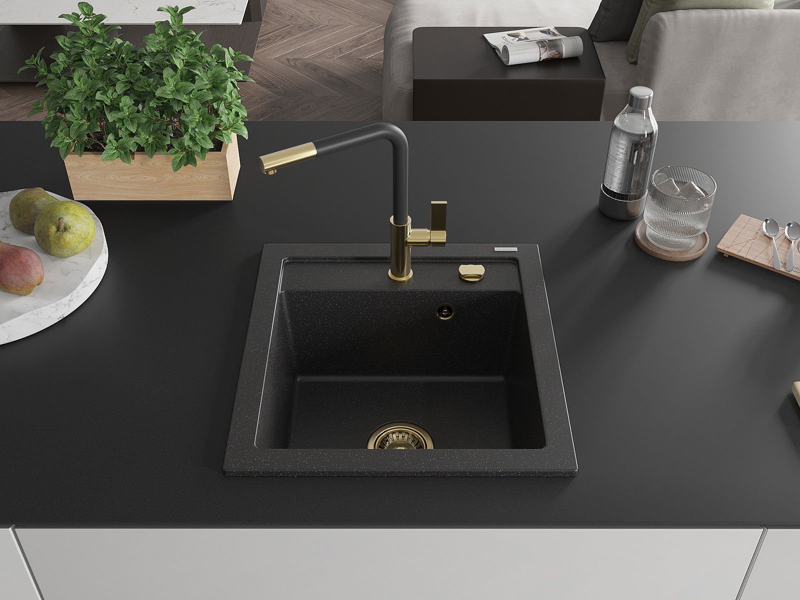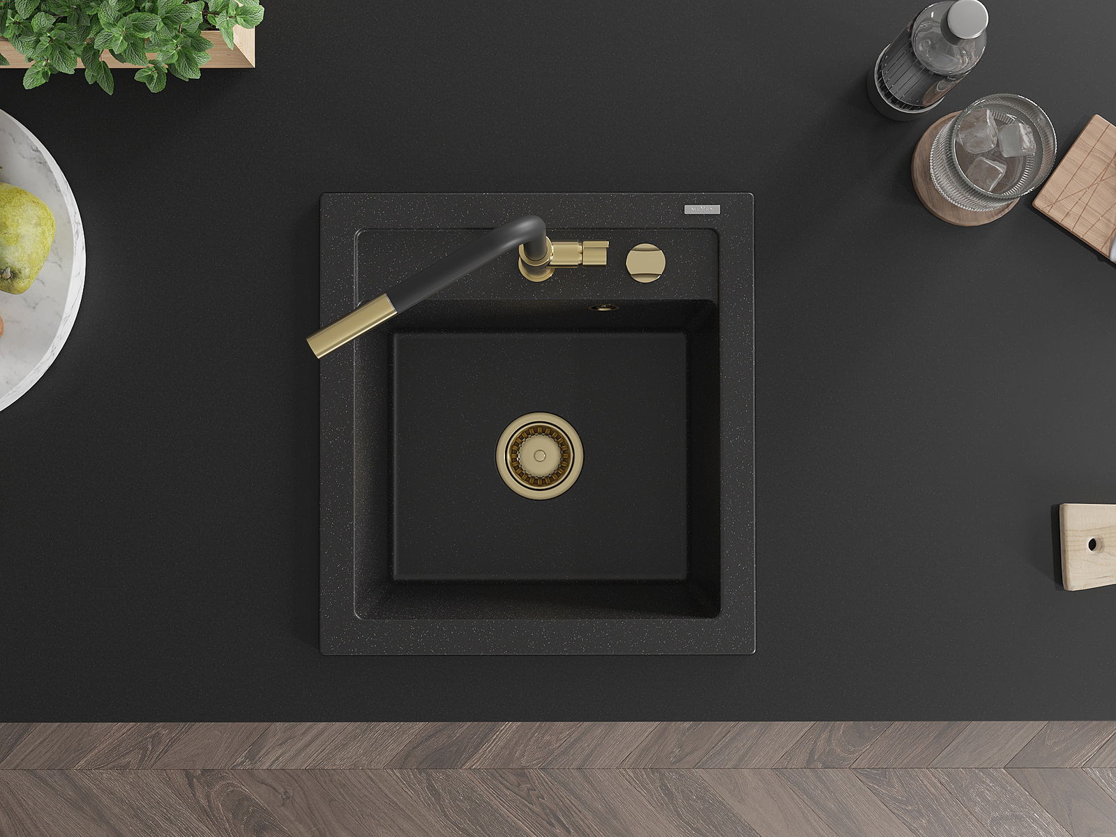 Mexen Vito évier en granit 1-bac avec robinet de cuisine Flora, noir/argent métallisé - 6503-73-670401-57-G