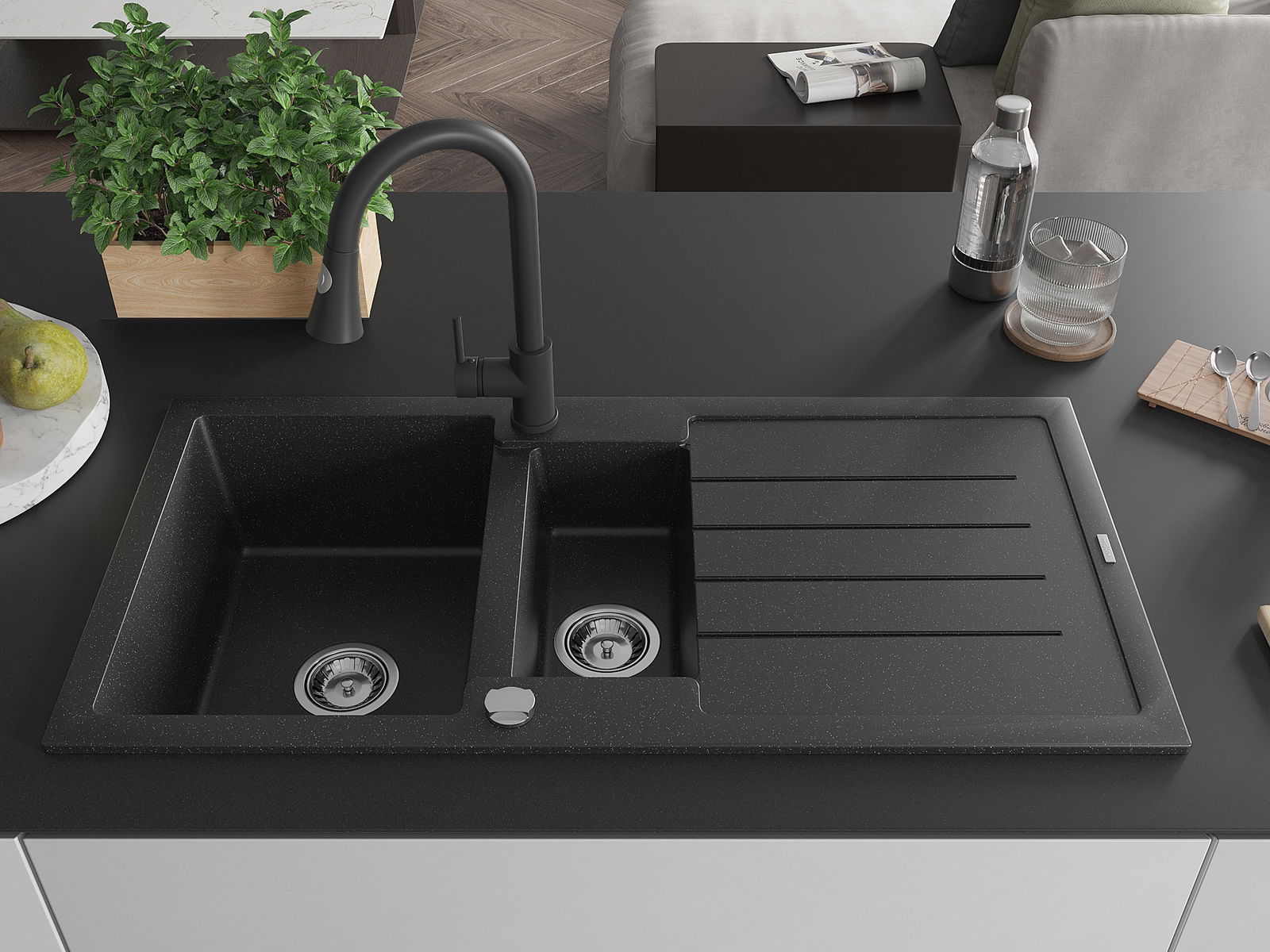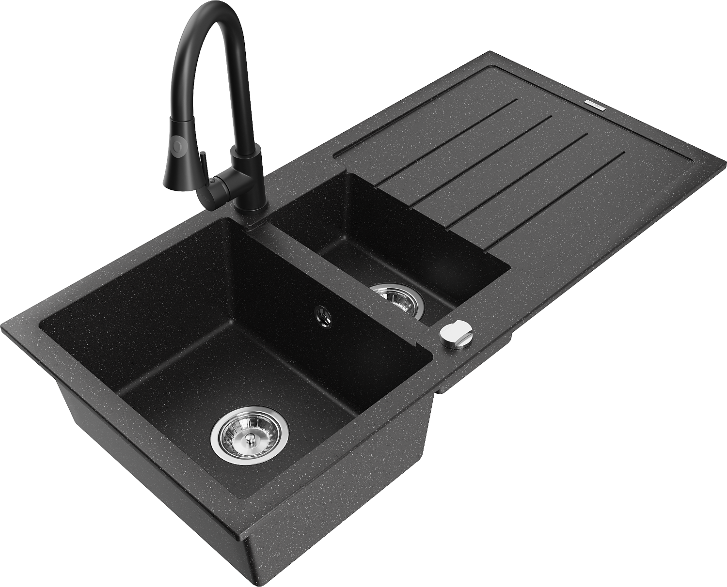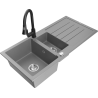 Mexen Andres évier en granit 1,5 bac avec égouttoir et robinet de cuisine Elia, noir/argent métallisé - 6515-73-670101-70