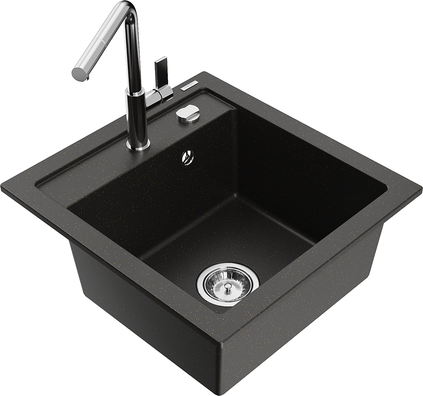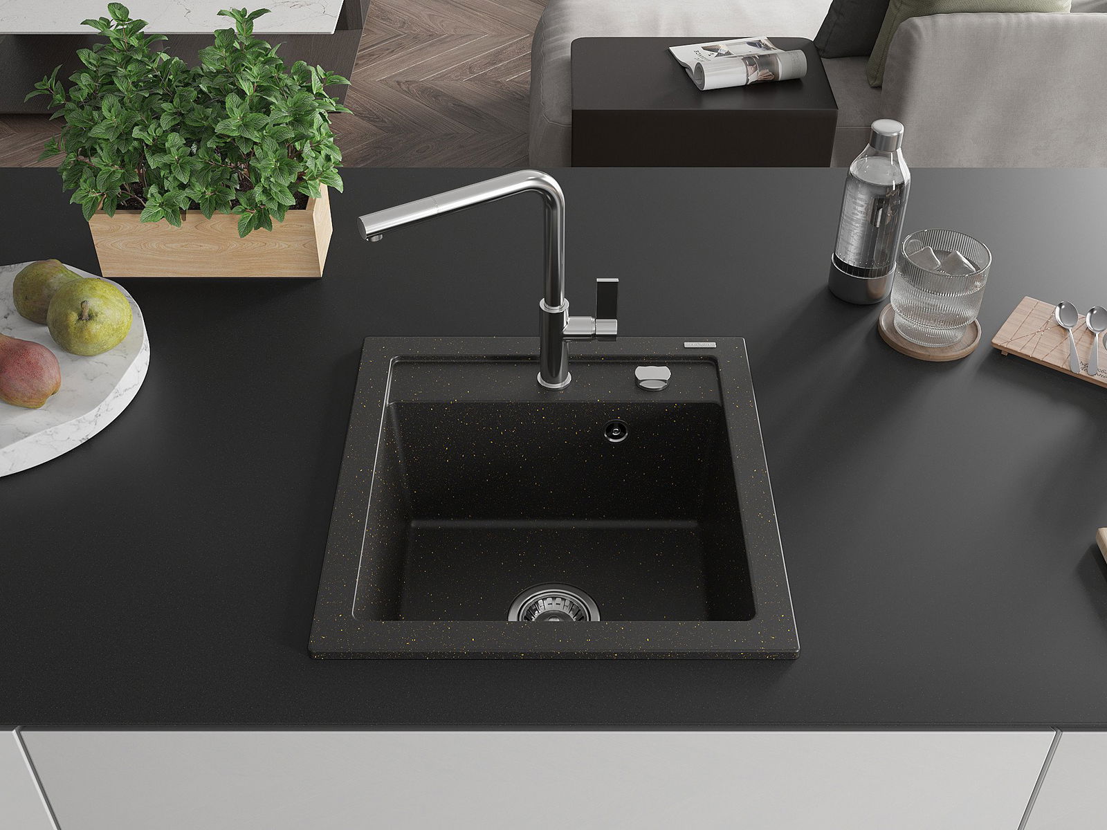 Mexen Vito évier en granit à 1 bac avec mitigeur de cuisine Flora, noir/or métallique - 6503-75-670401-00