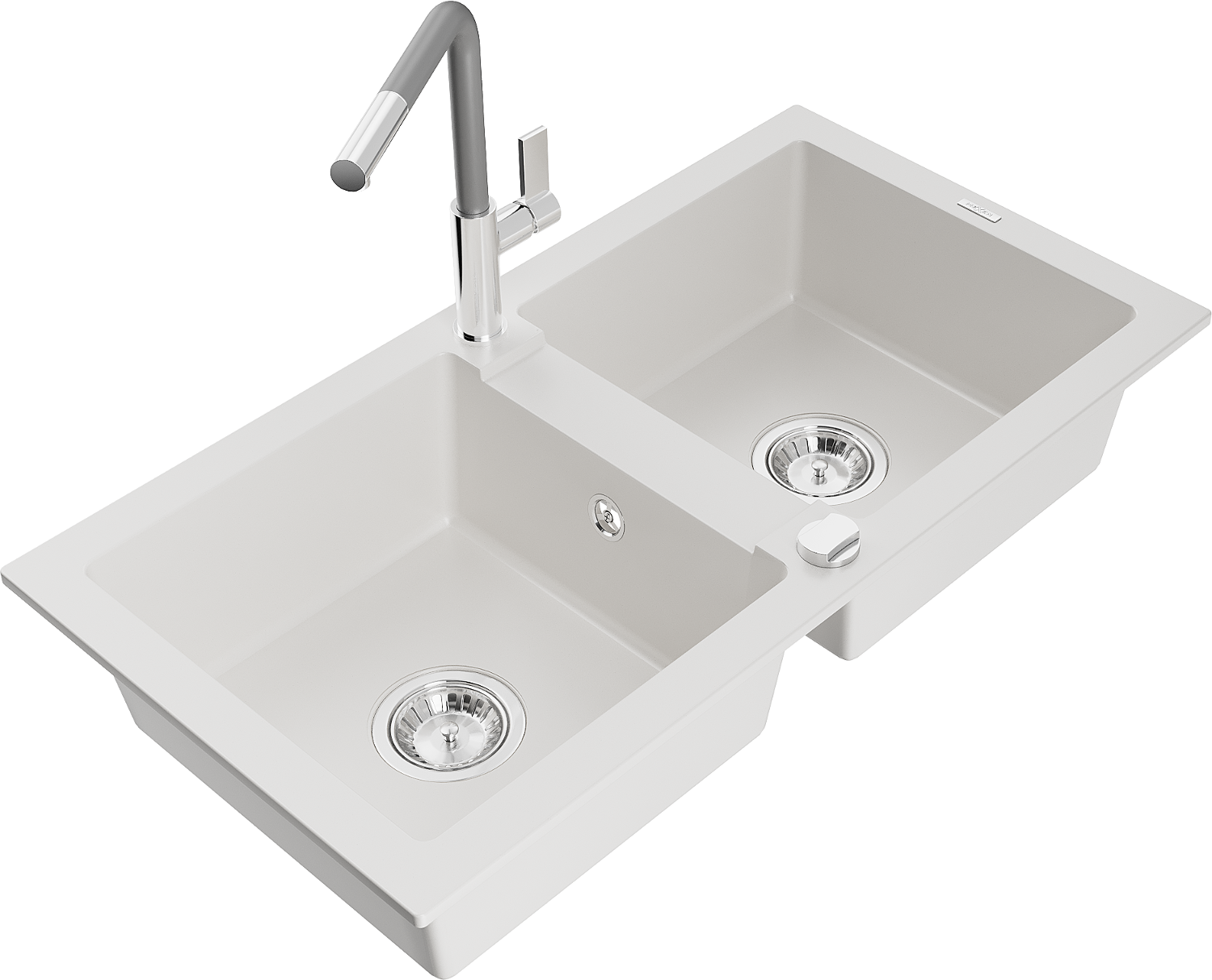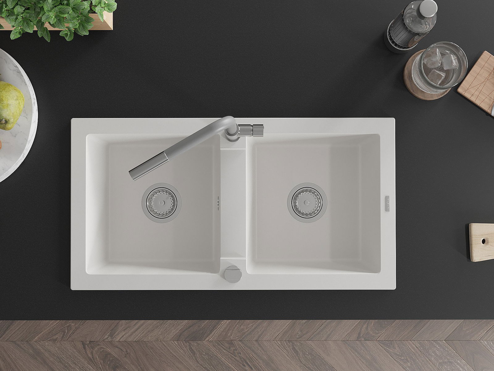 Mexen Mario évier en granit à 2 bacs avec robinet de cuisine Flora, blanc - 6504-20-670401-06