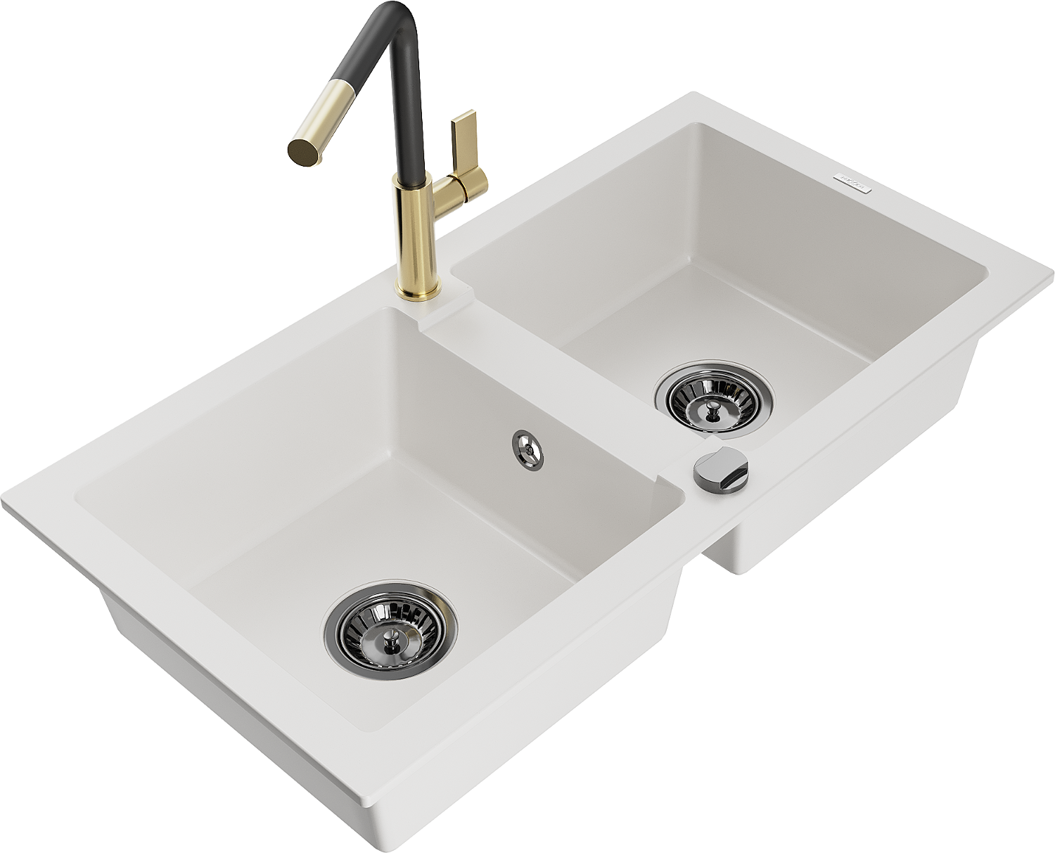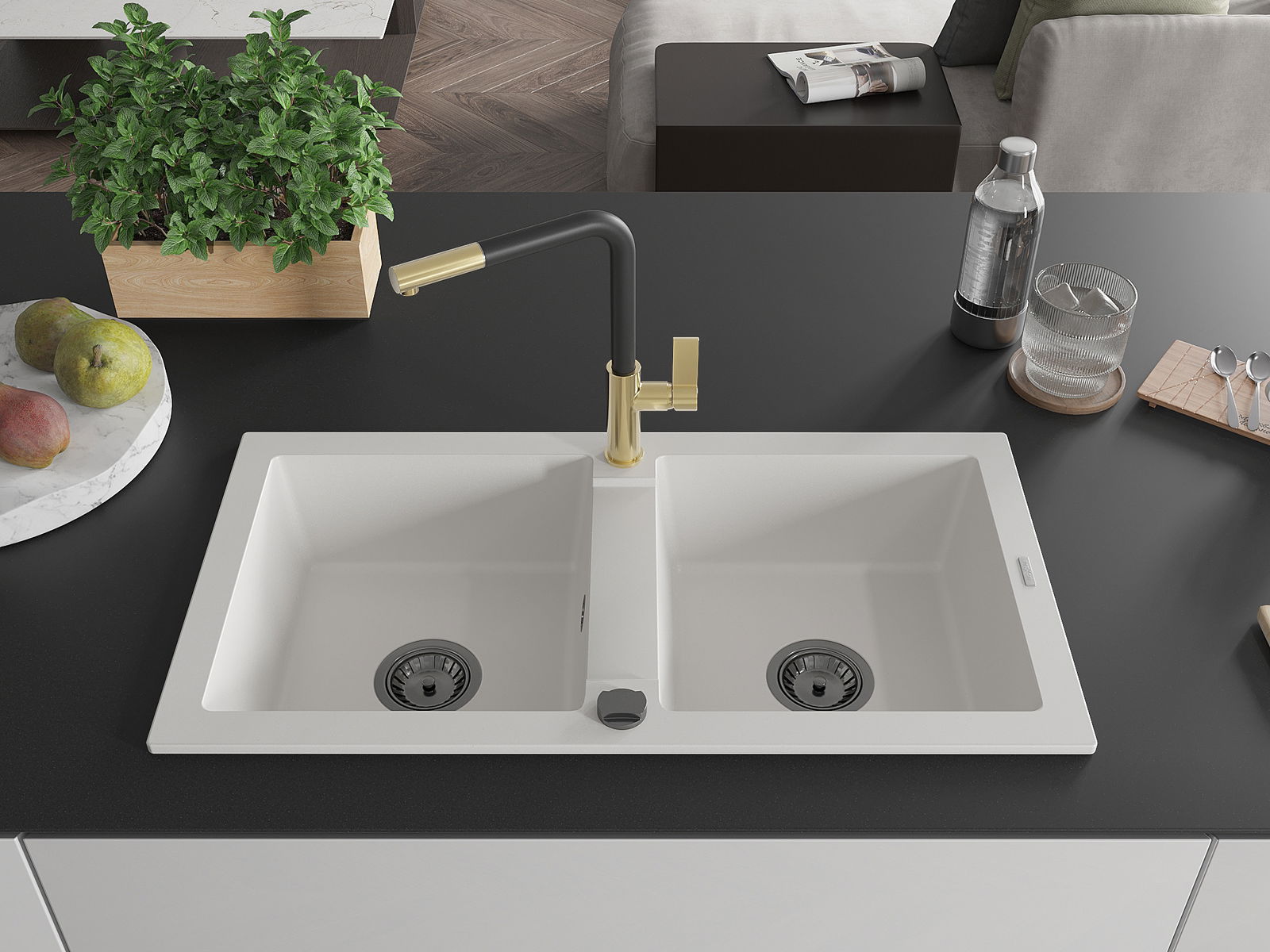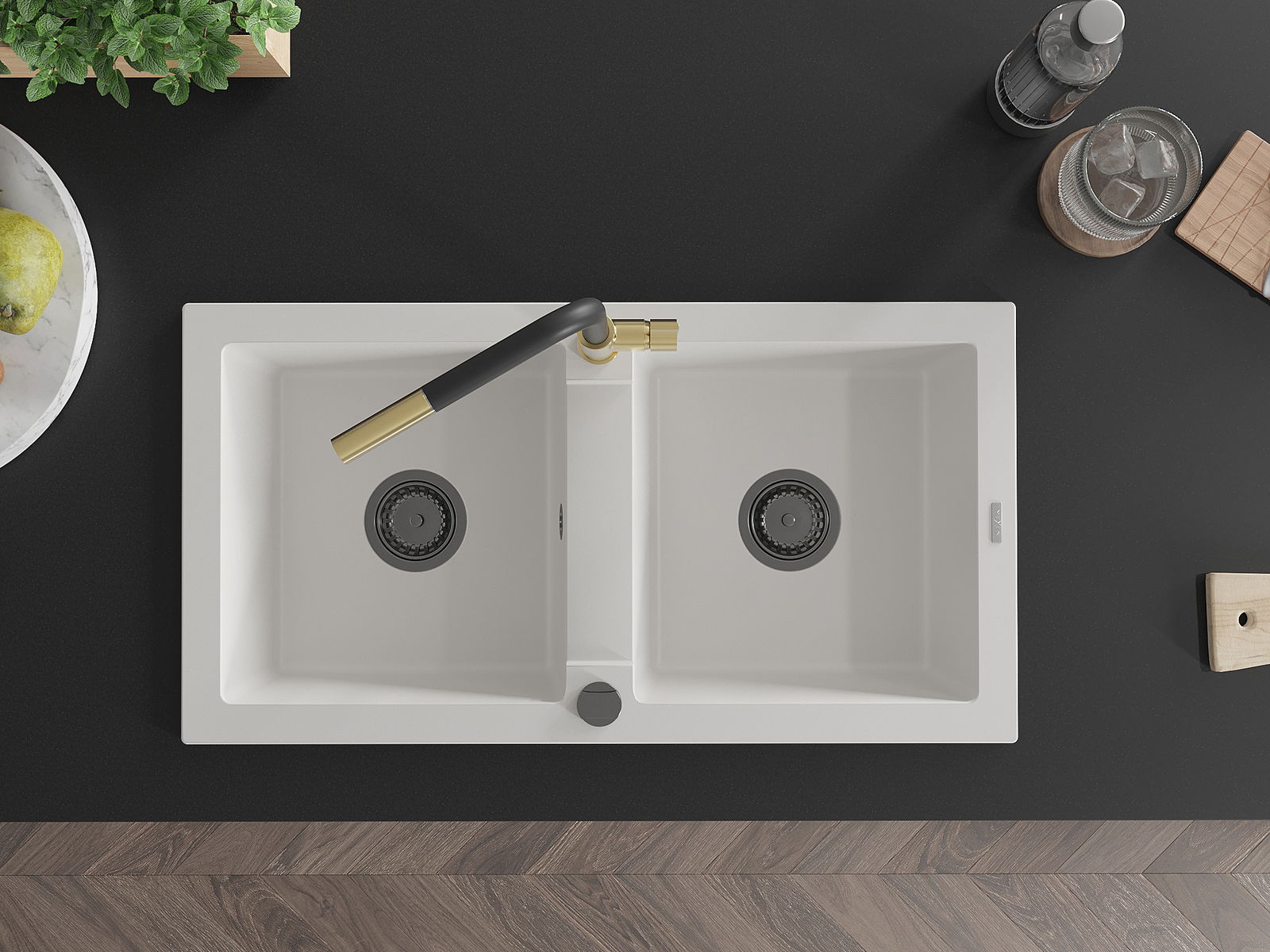 Mexen Mario évier en granit à 2 bacs avec robinet de cuisine Flora, blanc - 6504-20-670401-57-B