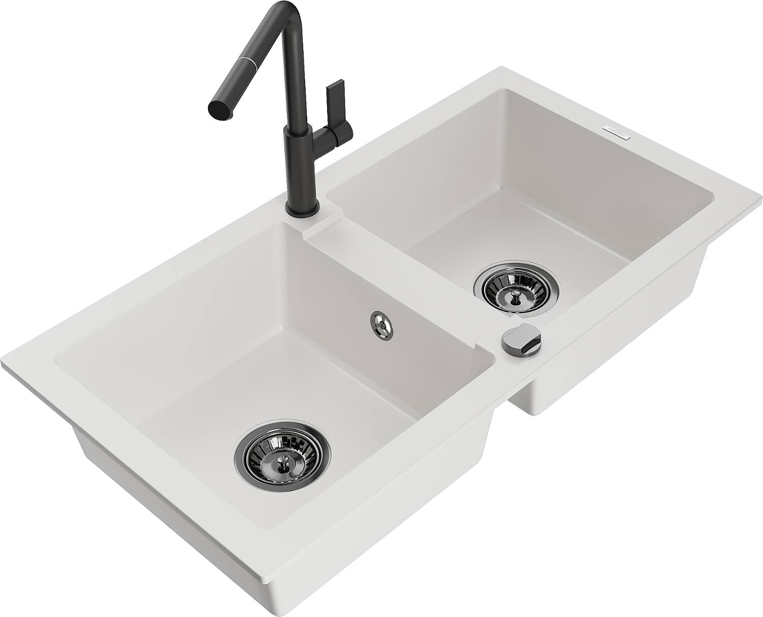 Mexen Mario évier en granit 2 bacs avec robinet de cuisine Flora, blanc - 6504-20-670401-70-B
