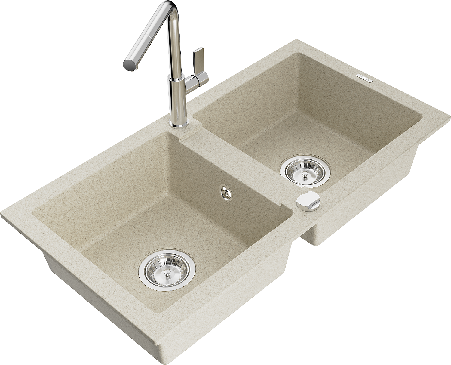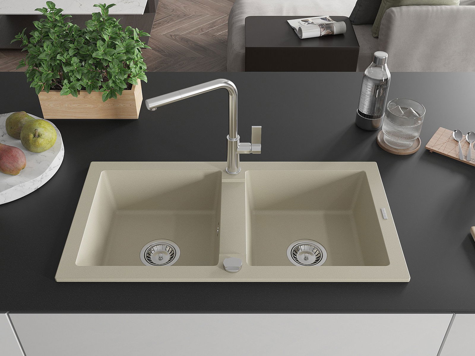 Mexen Mario évier en granit à 2 bacs avec robinet de cuisine Flora, beige - 6504-69-670401-00