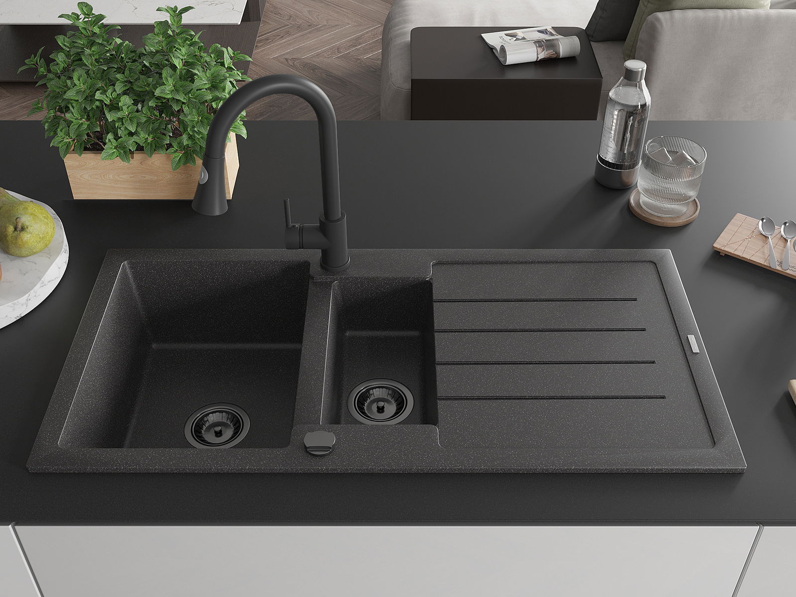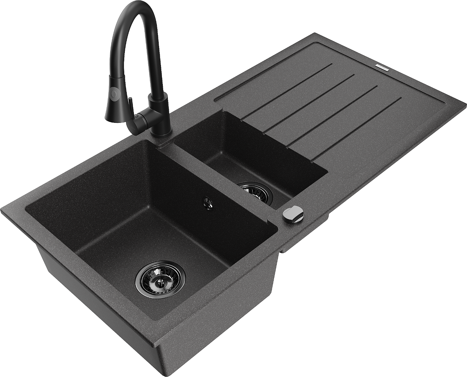 Mexen Andres évier en granit 1,5 bac avec égouttoir et robinet de cuisine Elia, noir moucheté - 6515-76-670101-70-B