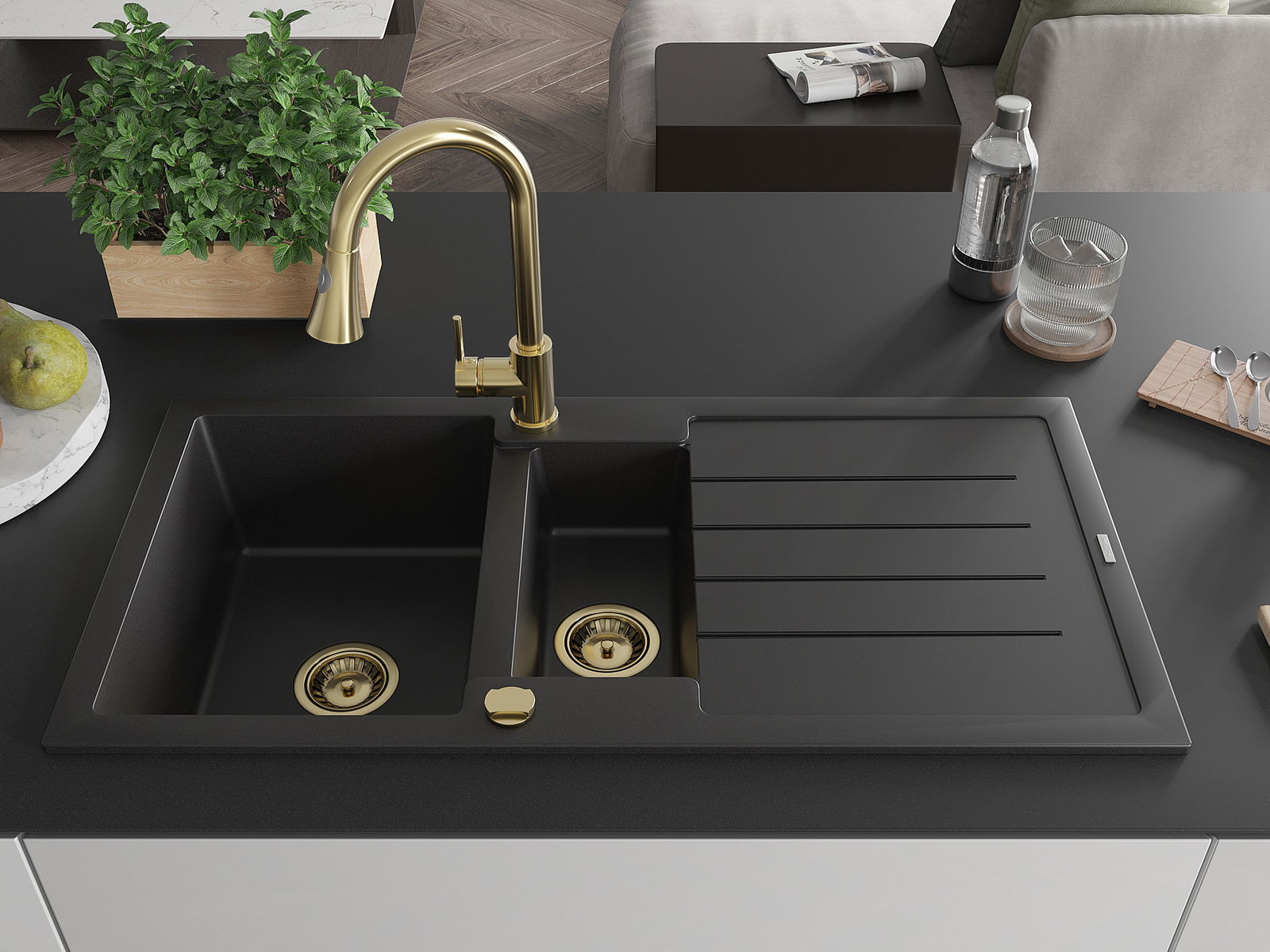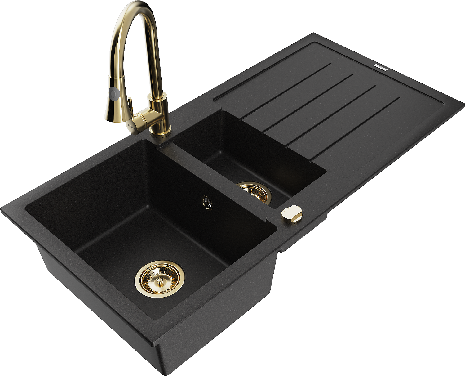 Mexen Andres évier de cuisine en granit 1,5 bac avec égouttoir et robinet Elia, noir - 6515-77-670101-50