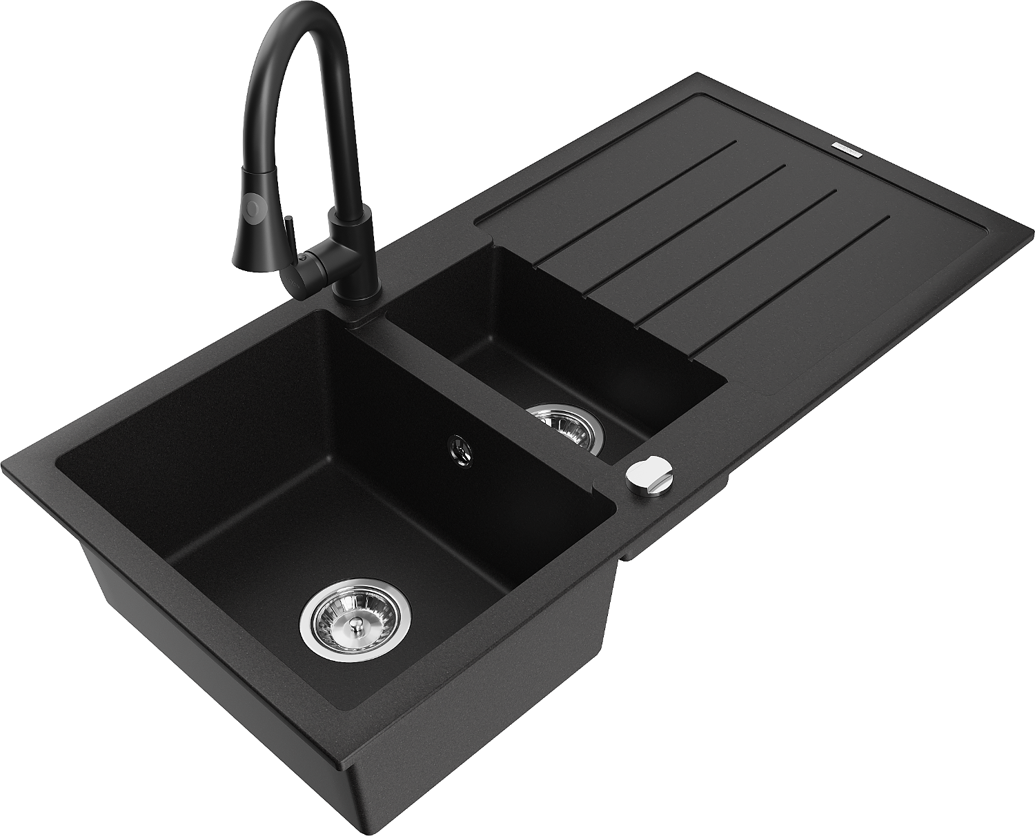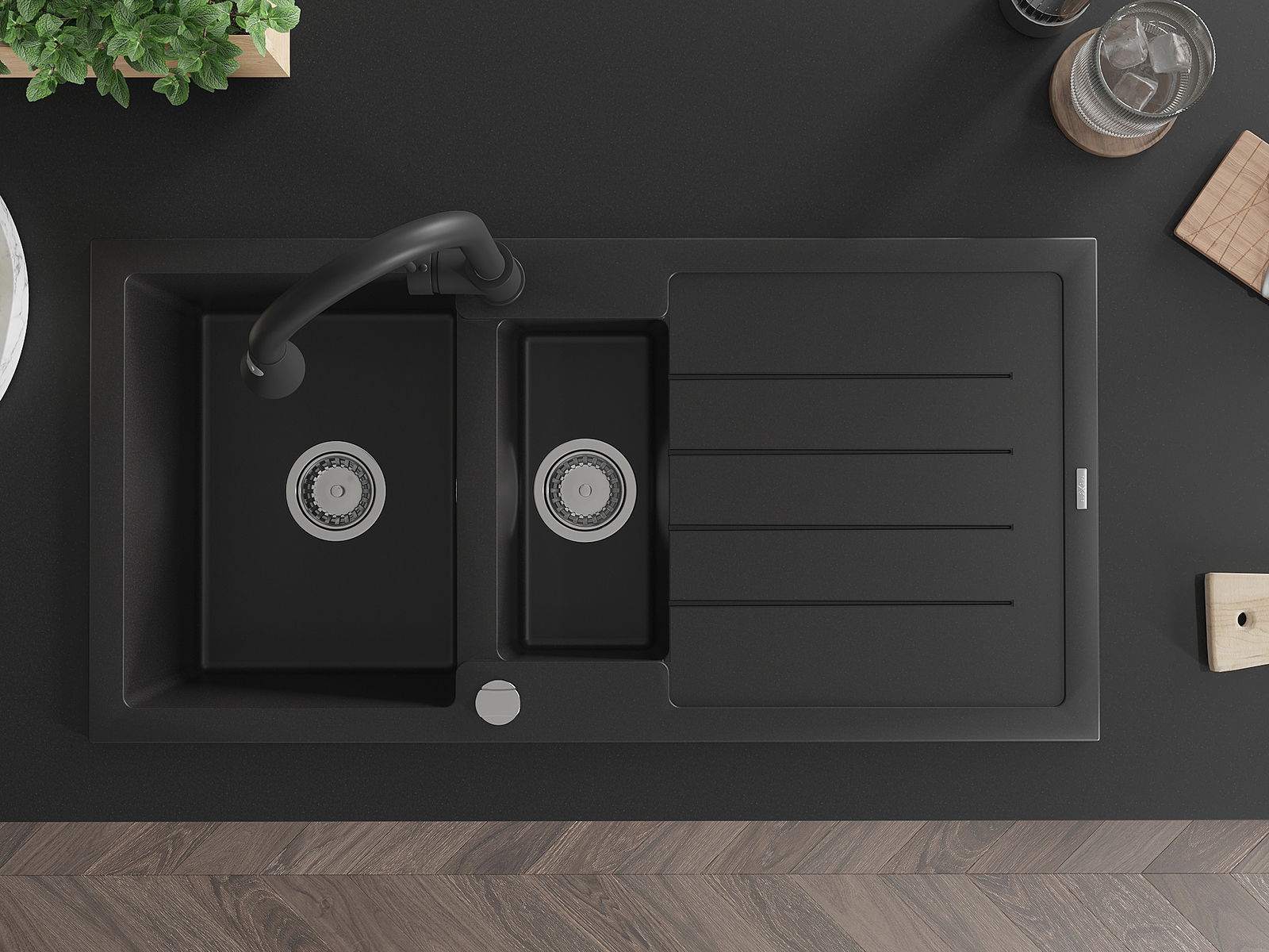 Mexen Andres évier en granit 1,5 bac avec égouttoir et robinet de cuisine Elia, noir - 6515-77-670101-70