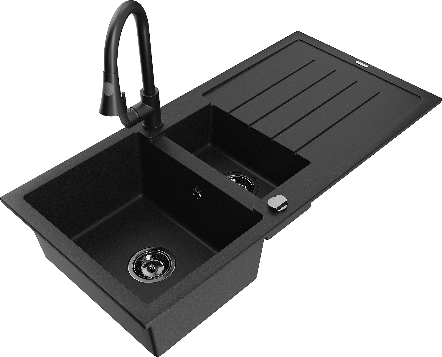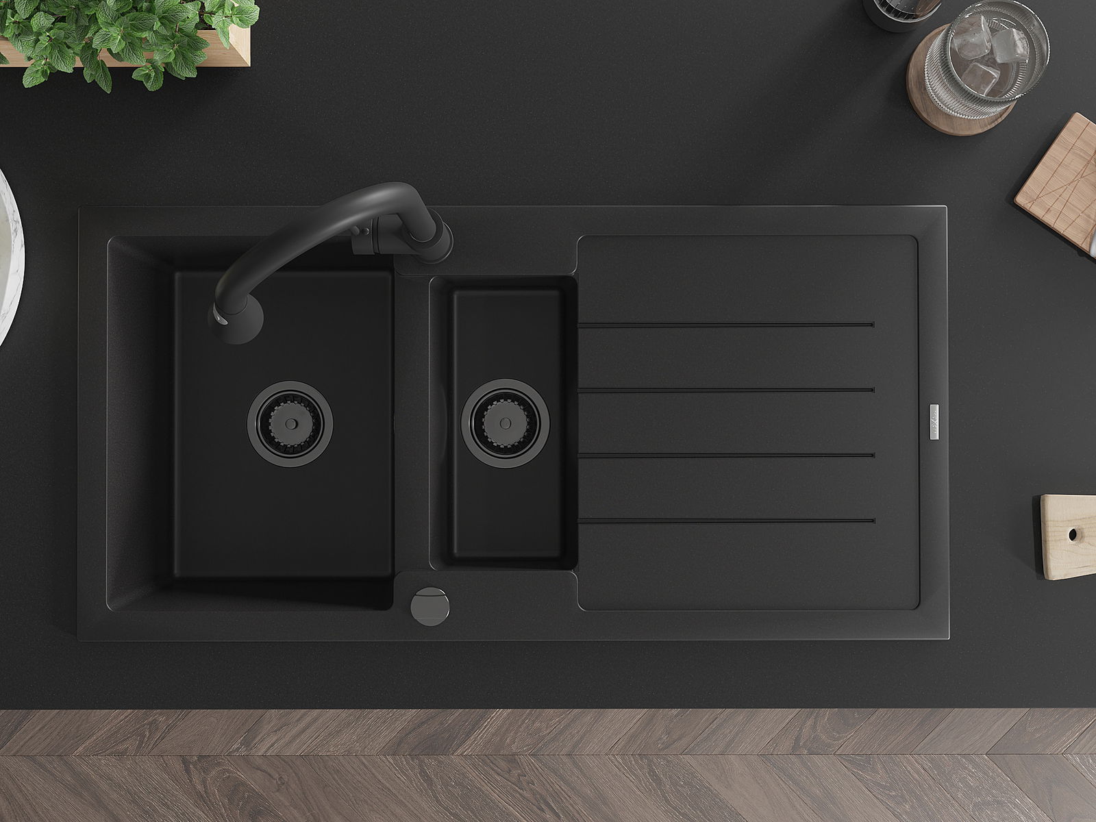 Mexen Andres évier en granit 1,5 bac avec égouttoir et robinet de cuisine Elia, noir - 6515-77-670101-70-B