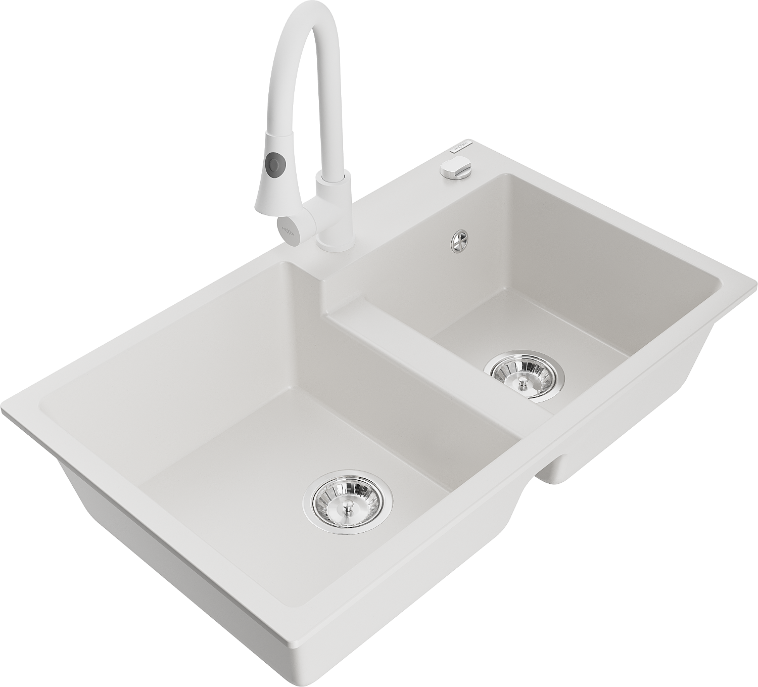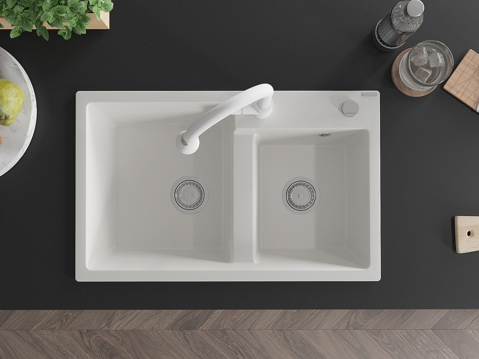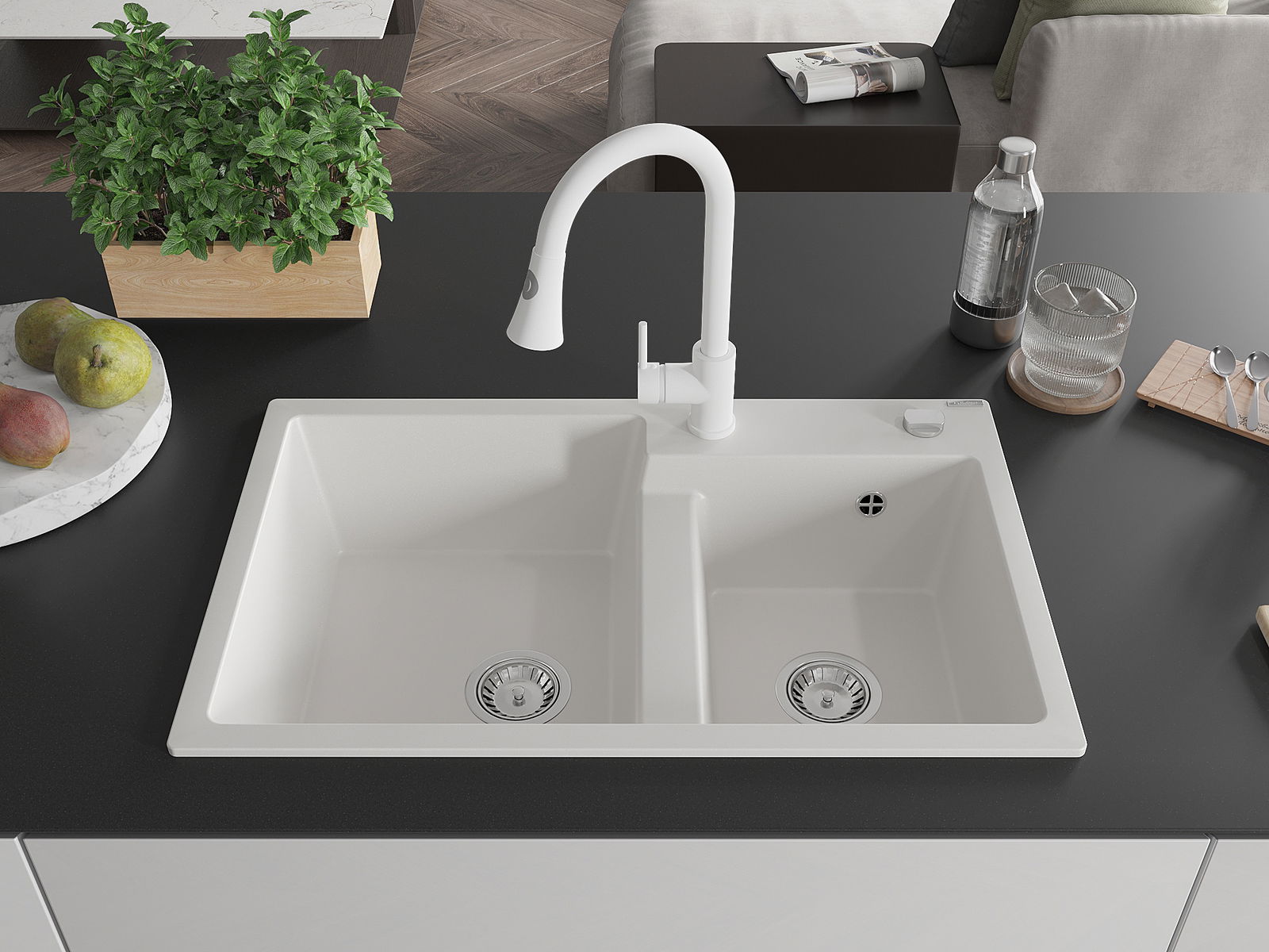 Mexen Tomas évier en granit 2 bacs avec robinet de cuisine Elia, blanc - 6516-20-670101-20