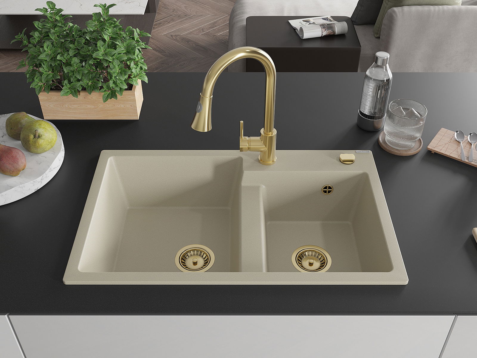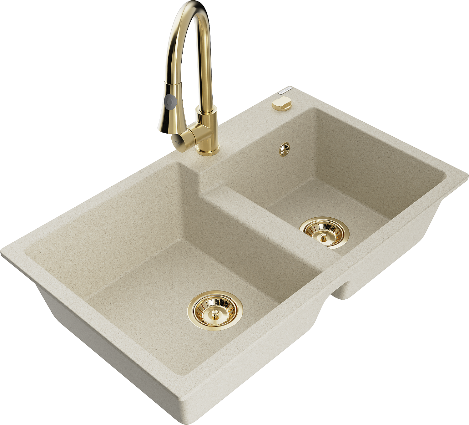 Mexen Tomas évier en granit 2 bacs avec mitigeur de cuisine Elia, beige - 6516-69-670101-50