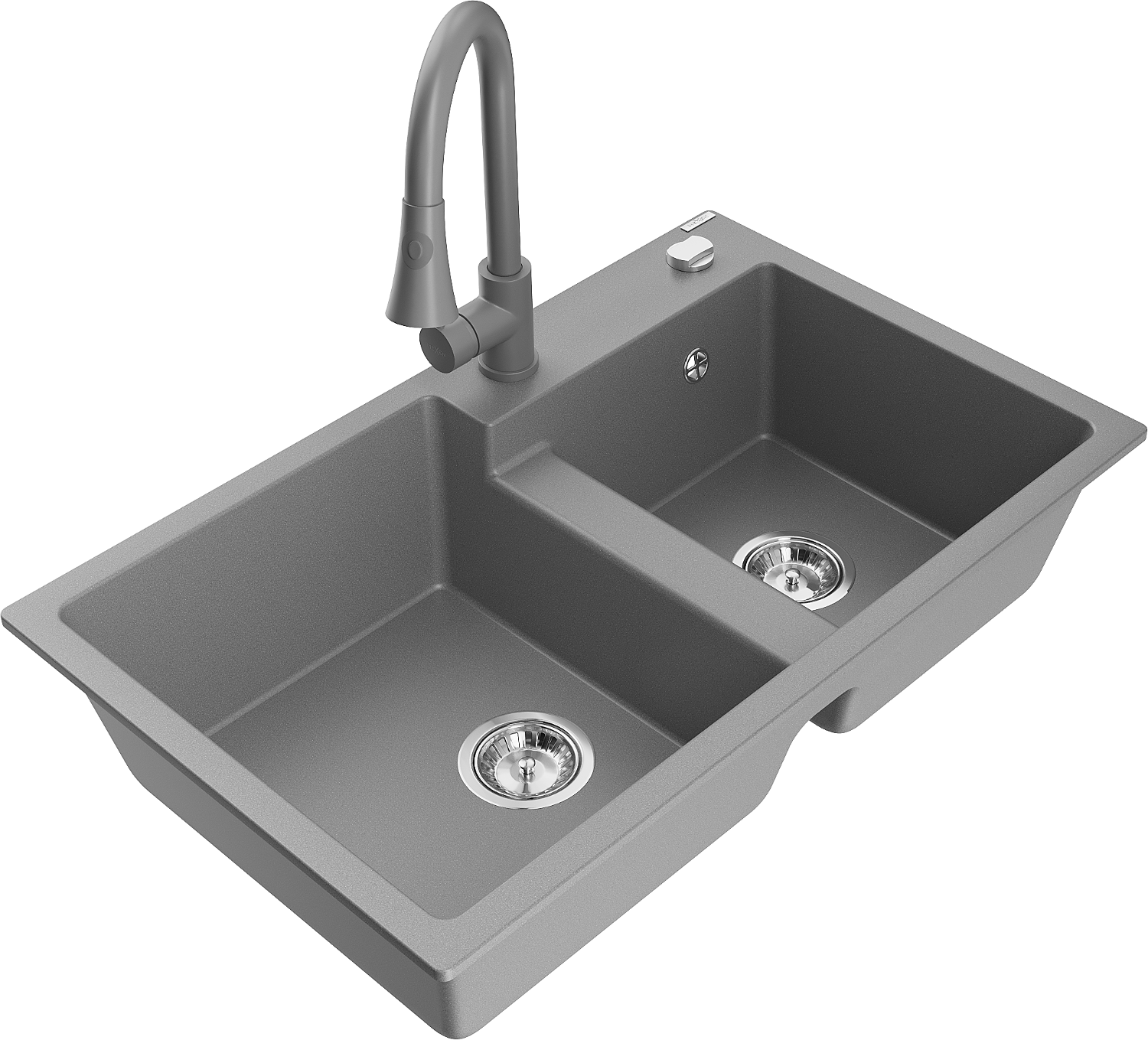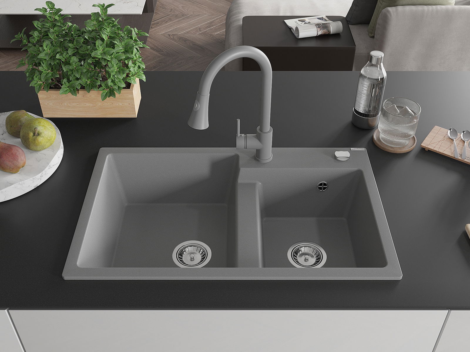 Mexen Tomas évier granit 2 bacs avec robinet de cuisine Elia, gris - 6516-71-670101-71
