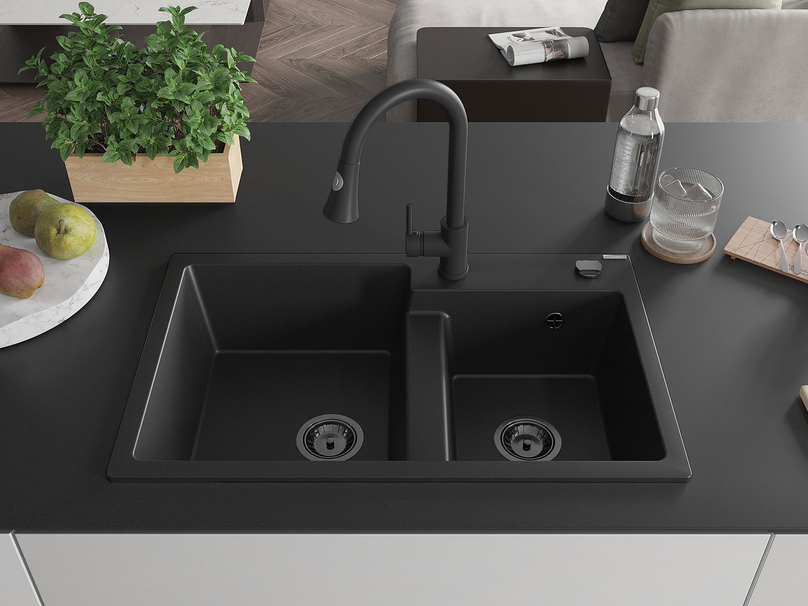 Mexen Tomas évier en granit à 2 bacs avec robinet de cuisine Elia, noir - 6516-77-670101-70-B