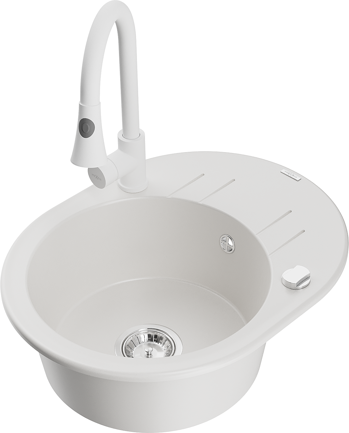 Mexen Kevin évier de cuisine en granit à 1 bac avec égouttoir et robinet de cuisine Elia, blanc - 6517-20-670101-20