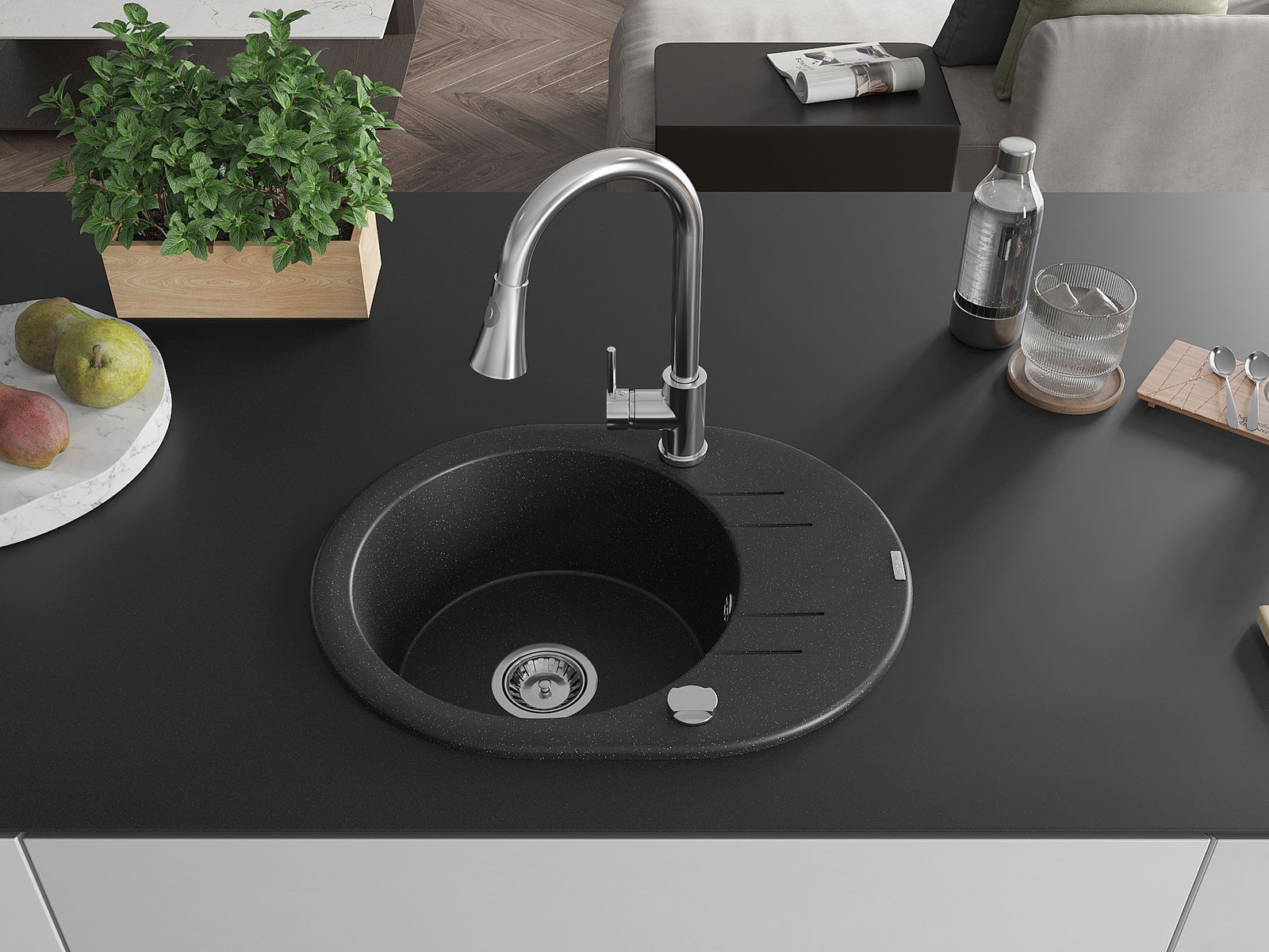 Mexen Kevin évier en granit à 1 bac avec égouttoir et robinet de cuisine Elia, noir/métallisé argent - 6517-73-670101-00
