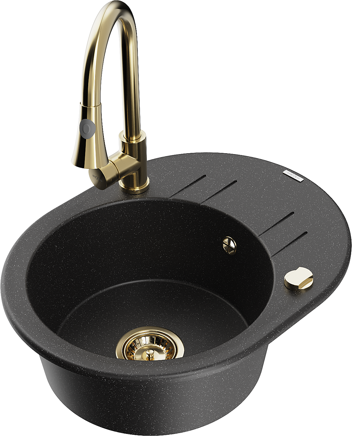 Mexen Kevin évier en granit 1 bac avec égouttoir et robinet de cuisine Elia, noir/métallisé argent - 6517-73-670101-50