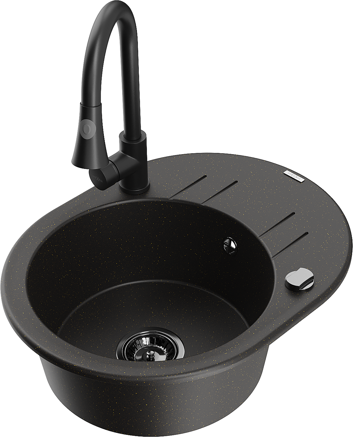 Mexen Kevin évier en granit à 1 bac avec égouttoir et robinet de cuisine Elia, noir/doré métallisé - 6517-75-670101-70-B