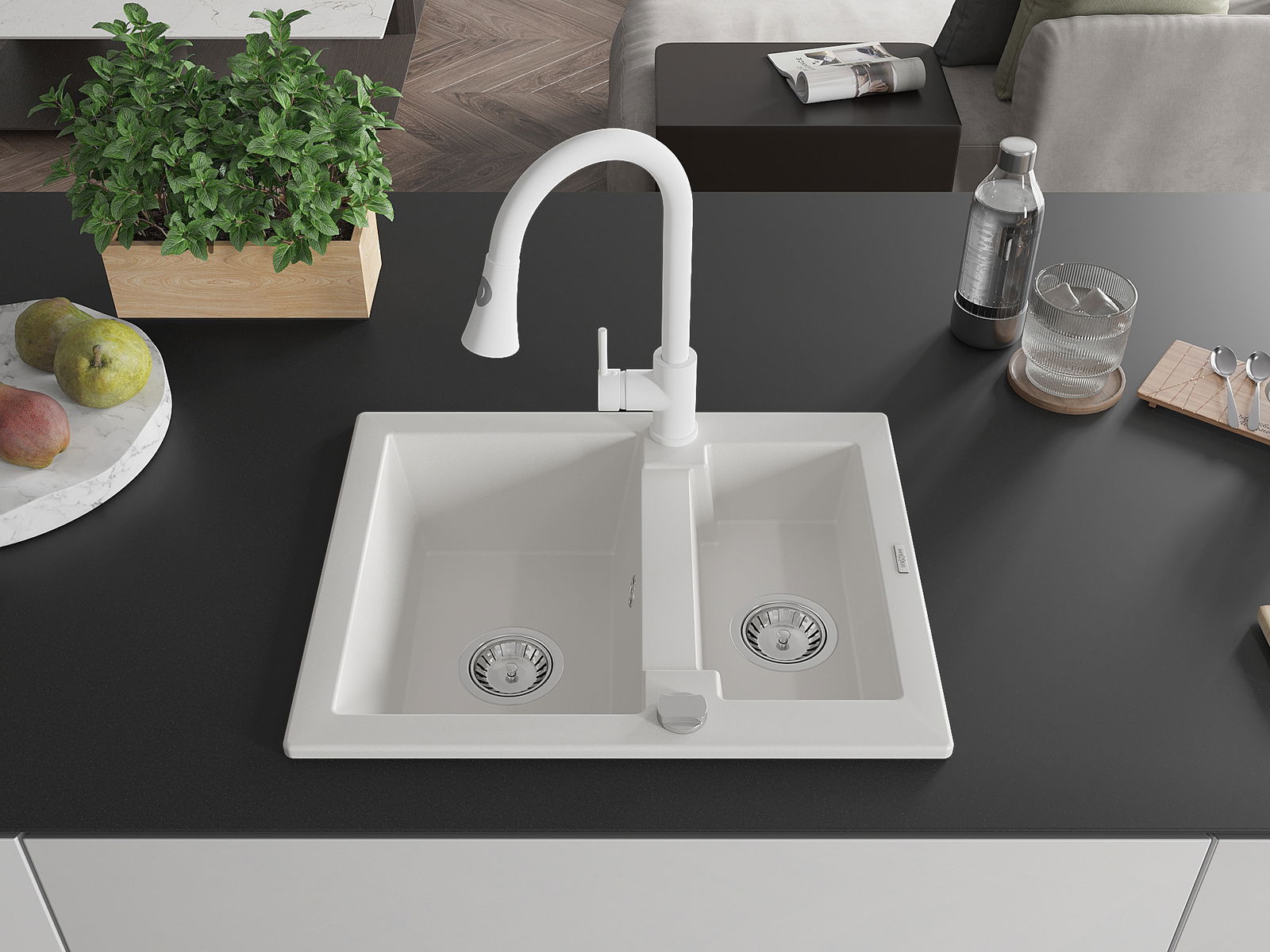 Mexen Carlos évier en granit 1,5 cuves avec robinet de cuisine Elia, blanc - 6518-20-670101-20