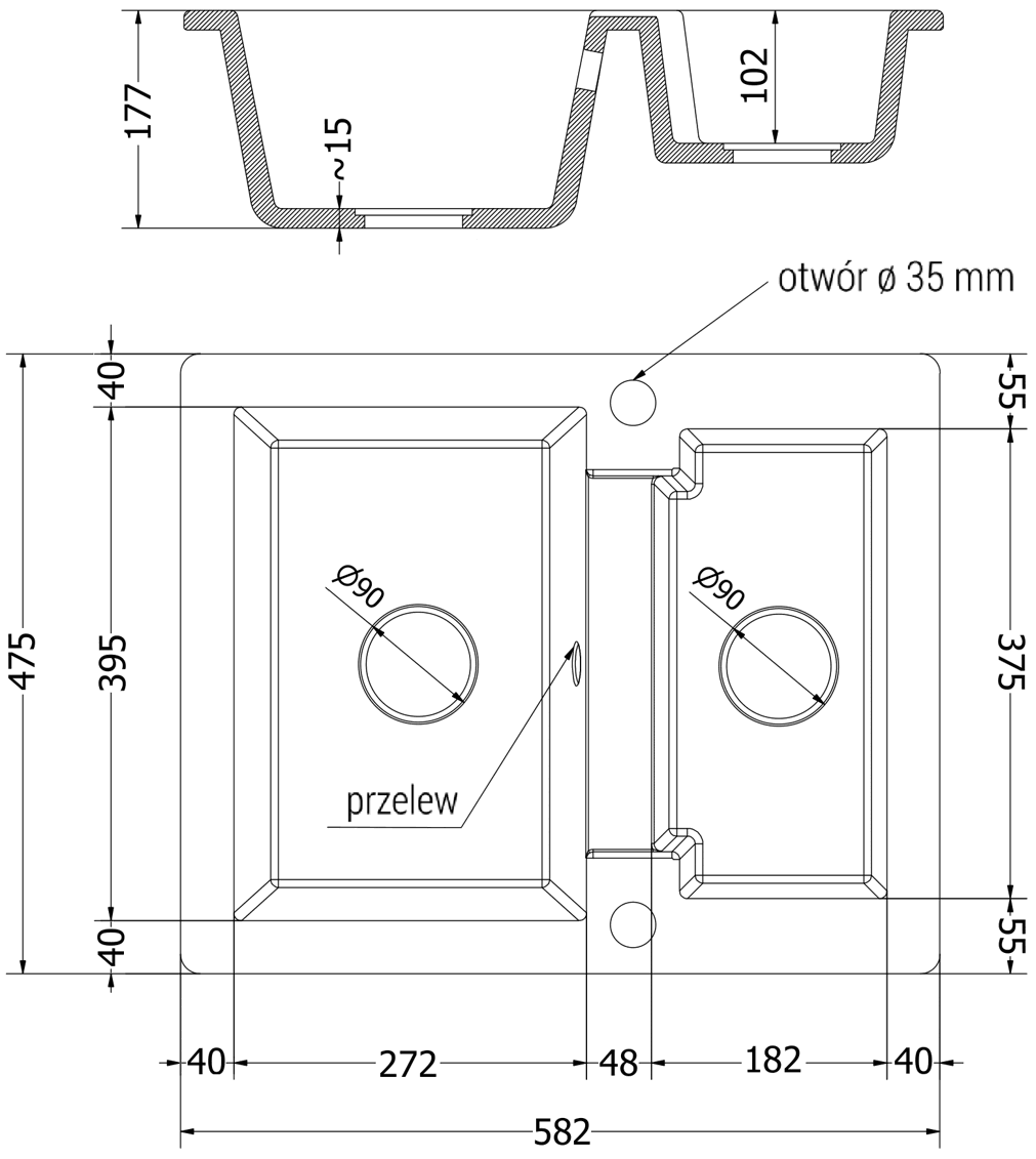 Profondeur de la cuve: 162 mm (grande), 102 mm (petite)