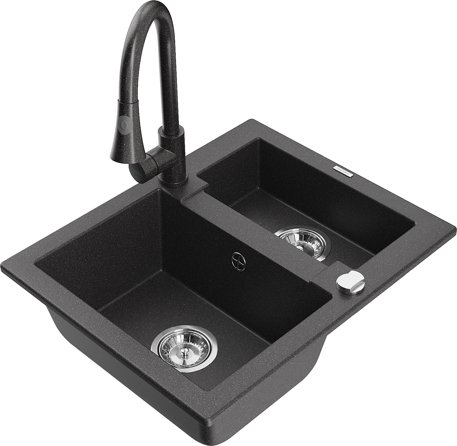 Mexen Carlos évier en granit 1,5 bac avec robinet de cuisine Elia, noir moucheté - 6518-76-670101-76