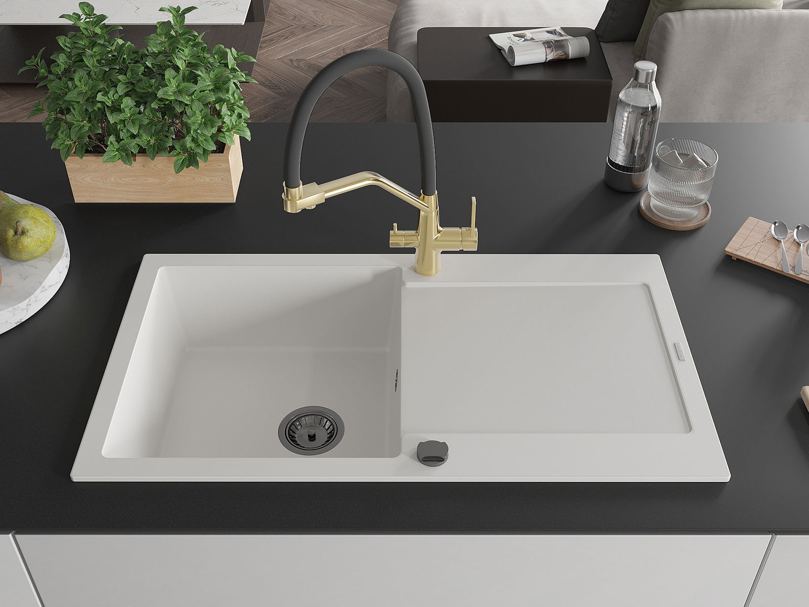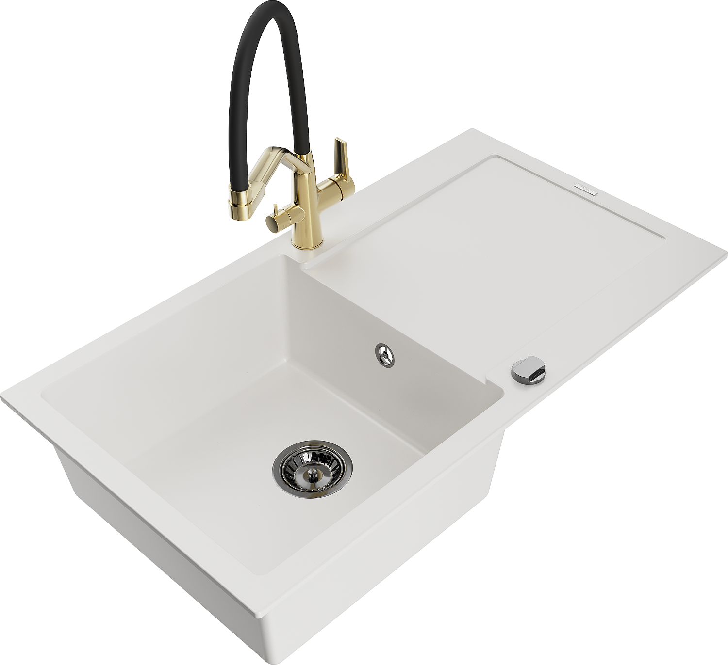 Mexen Leo évier en granit à 1 bac avec égouttoir et robinet de cuisine Duo, blanc - 6501-20-671701-57-B