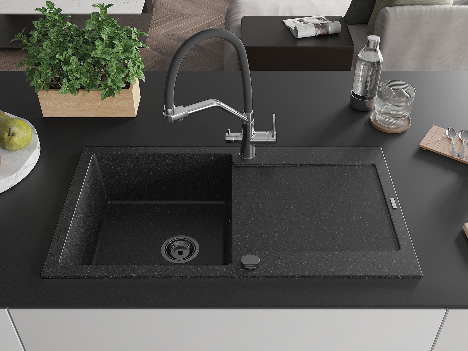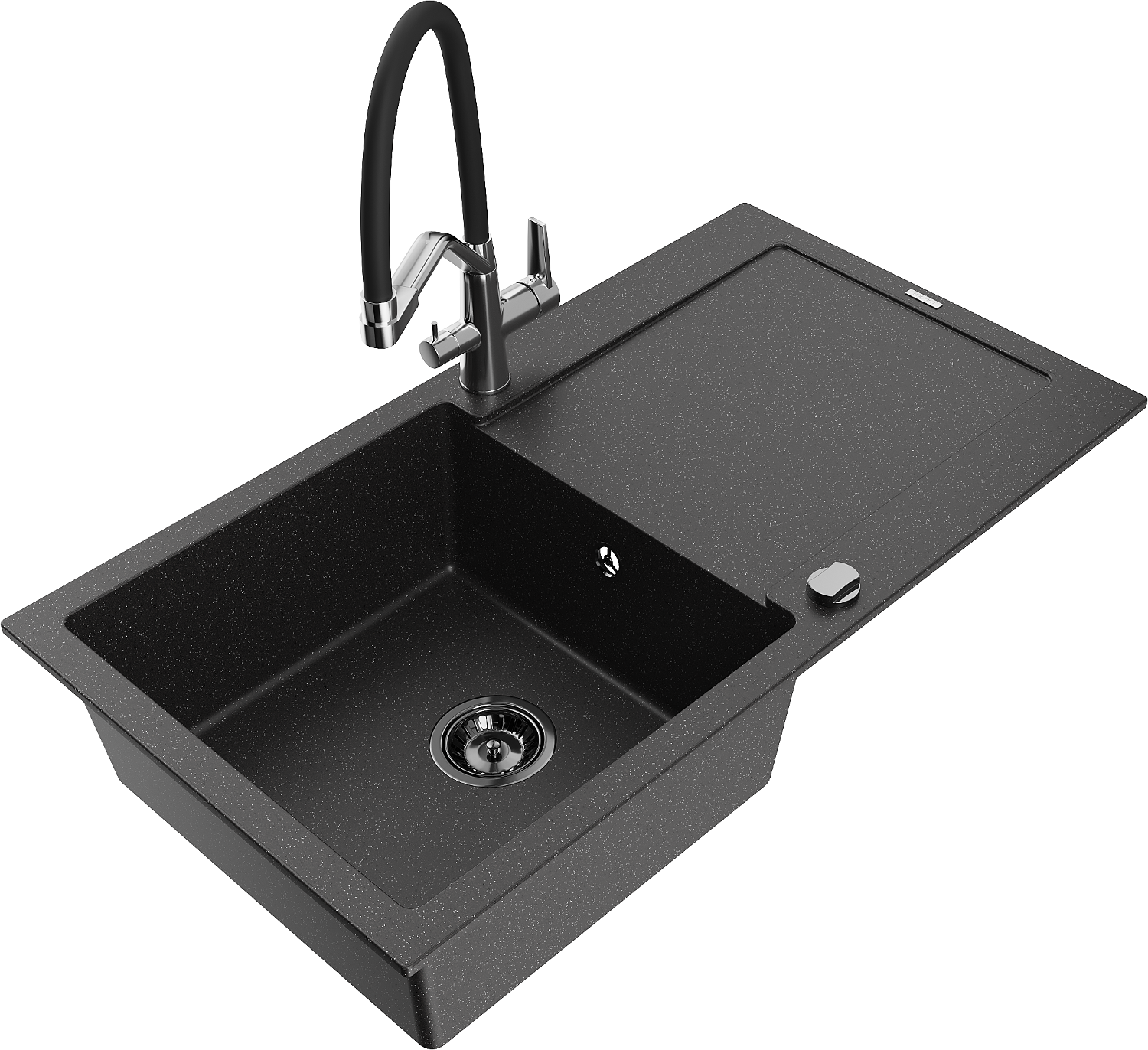 Mexen Leo évier en granit 1 bac avec égouttoir et mitigeur de cuisine Duo, noir/métallique argenté - 6501-73-671701-07-B