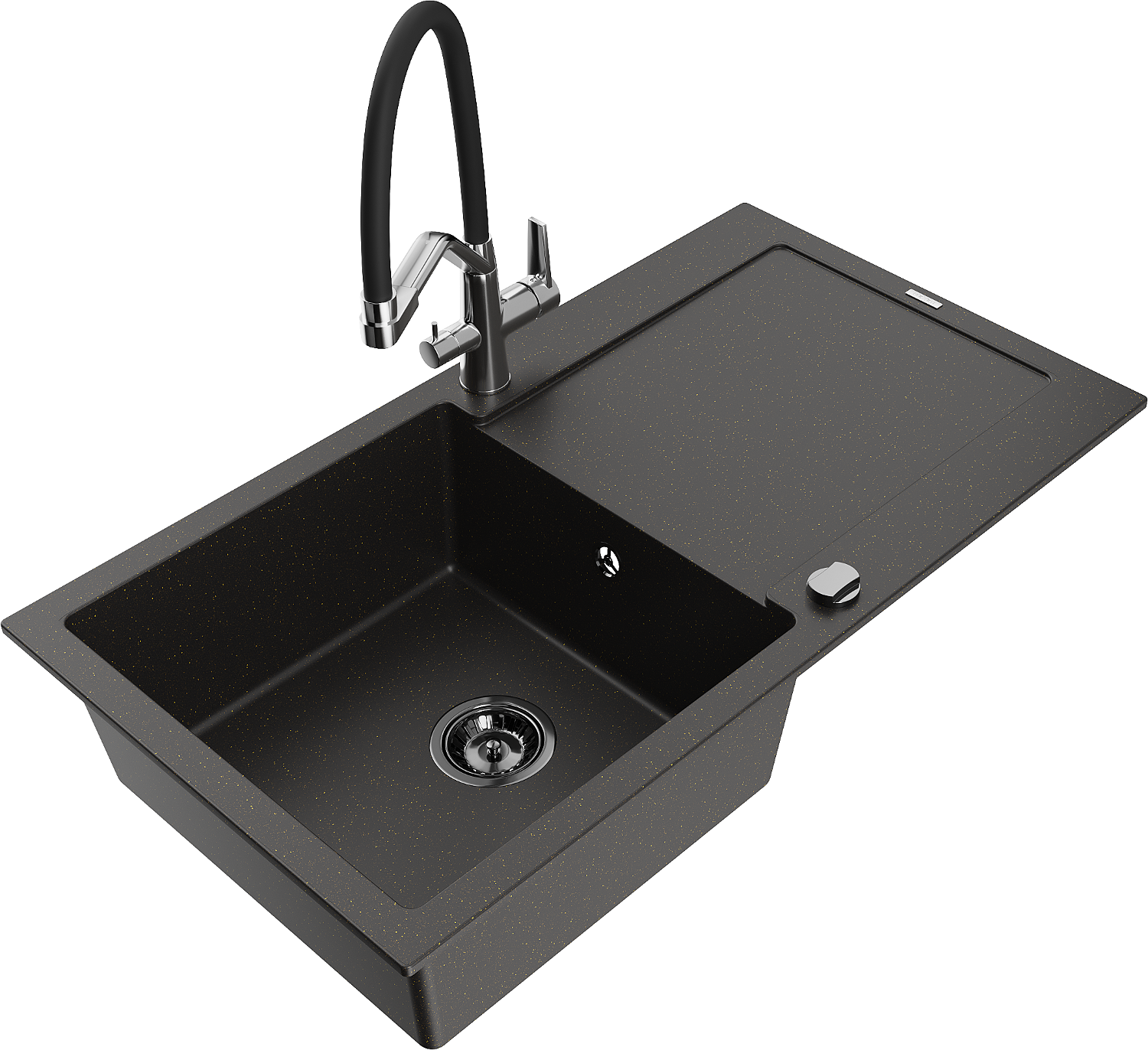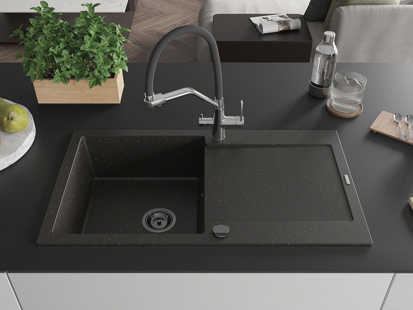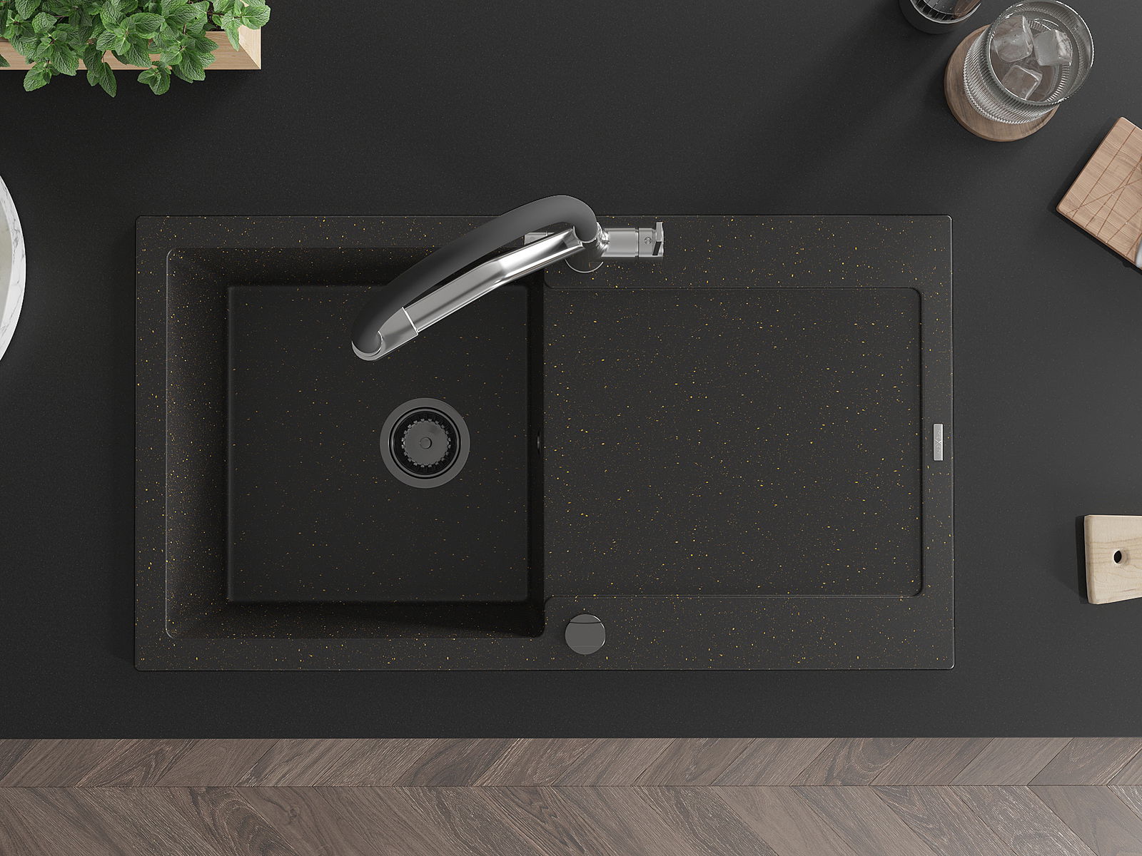 Mexen Leo évier en granit 1 bac avec égouttoir et mitigeur cuisine Duo, noir/métallique doré - 6501-75-671701-07-B
