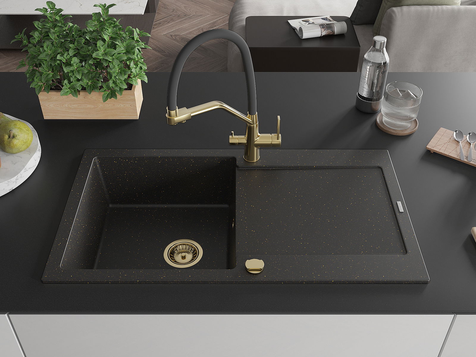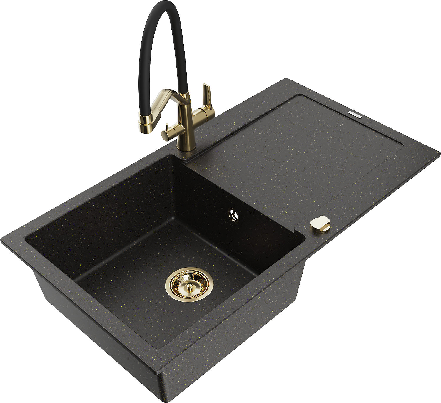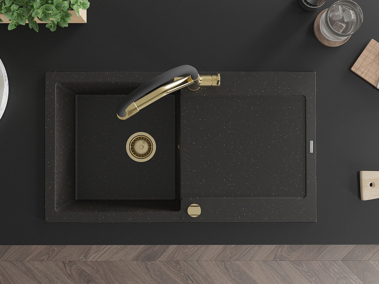 Mexen Leo évier de cuisine en granit 1 bac avec égouttoir et robinet de cuisine Duo, noir/or métallique - 6501-75-671701-57-G