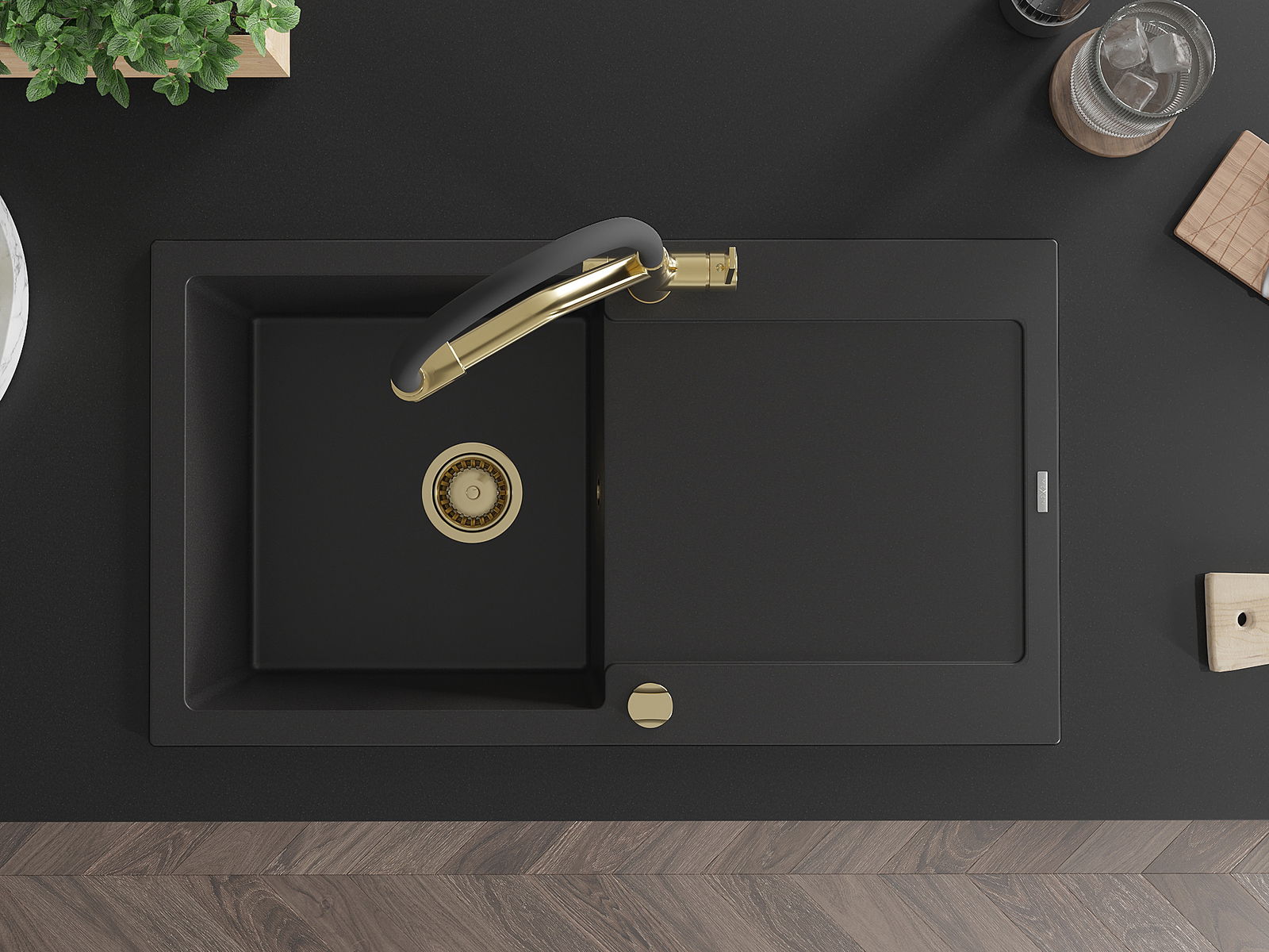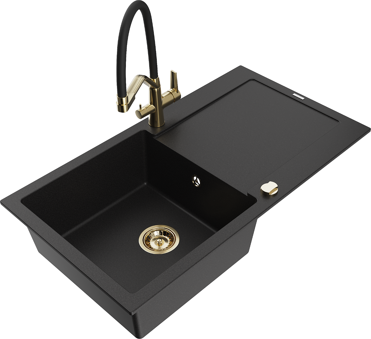 Mexen Leo évier en granit 1 bac avec égouttoir et robinet de cuisine Duo, noir - 6501-77-671701-57-G