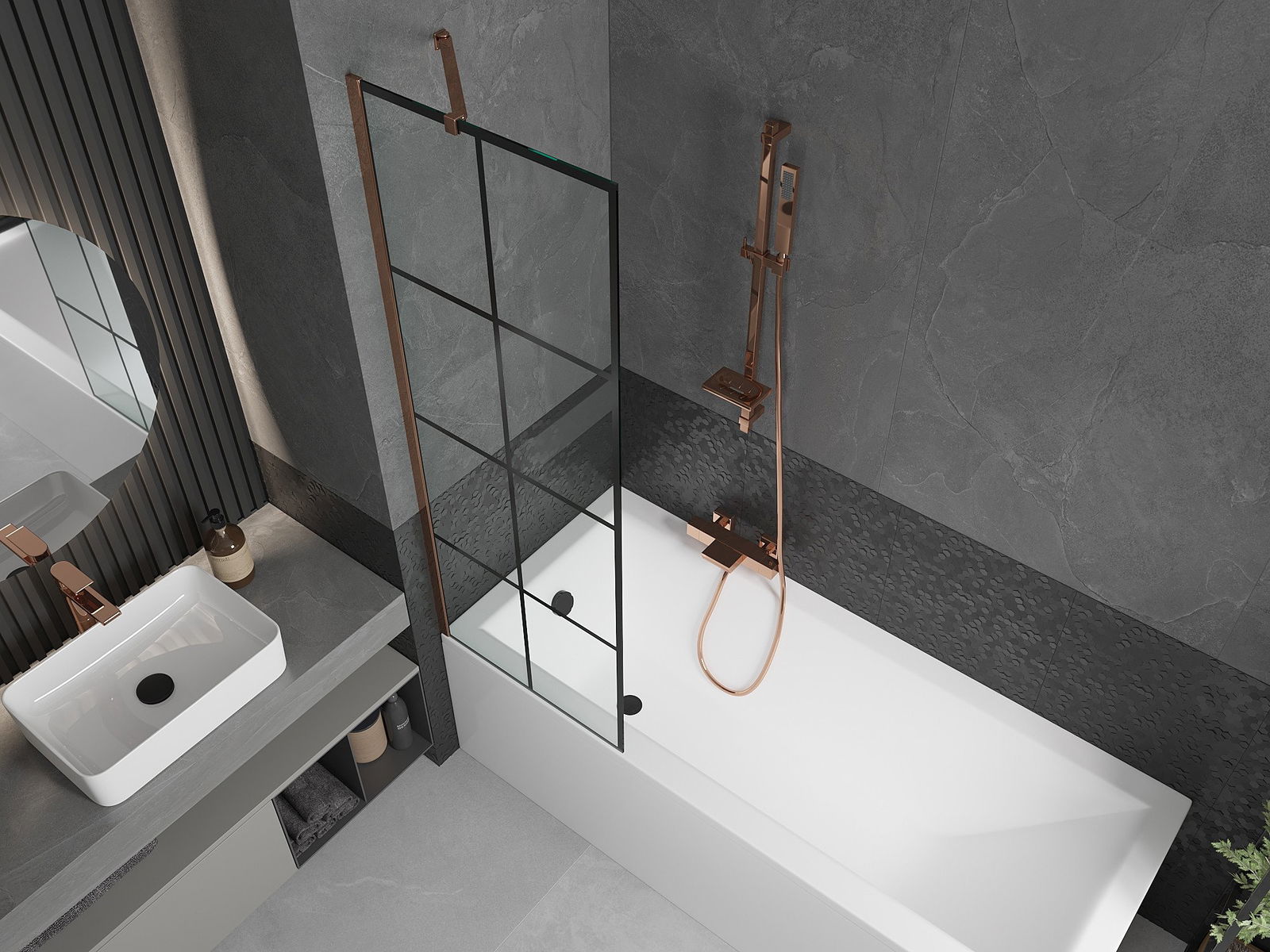 Mexen Next paroi de baignoire 1-volet 60 x 150 cm, grille noire, or rose - 895-060-000-00-77-60