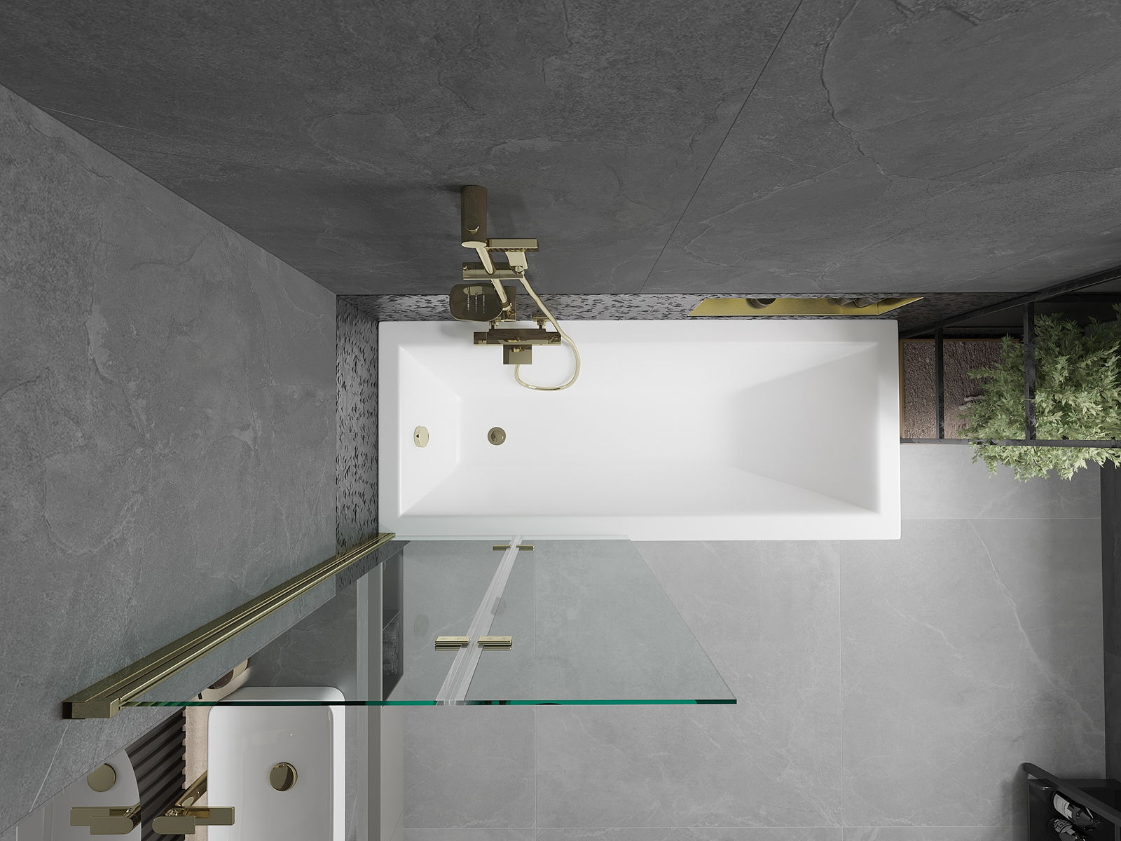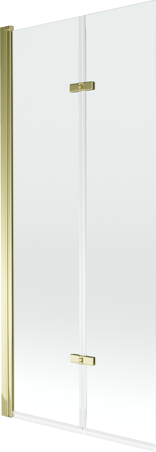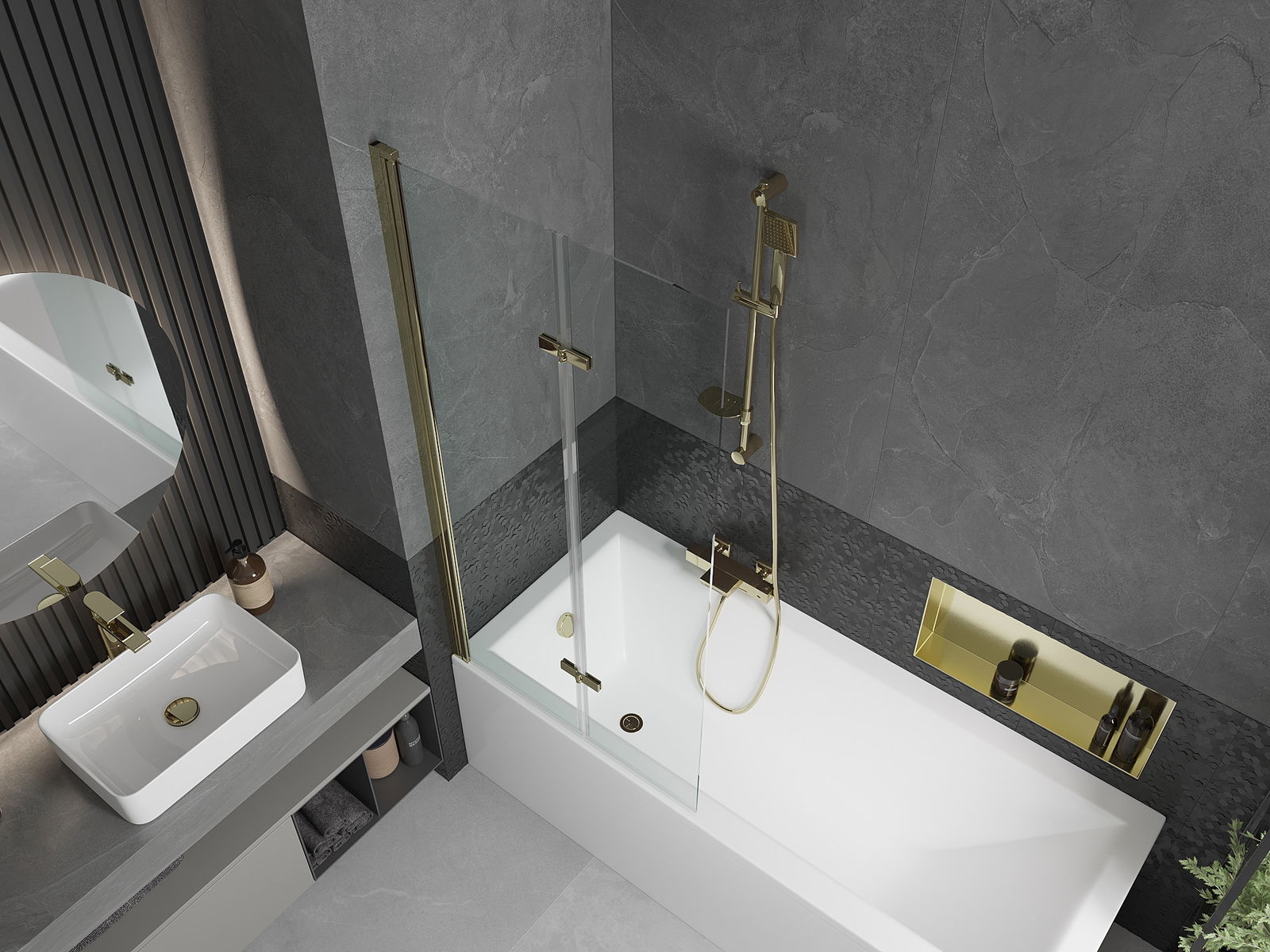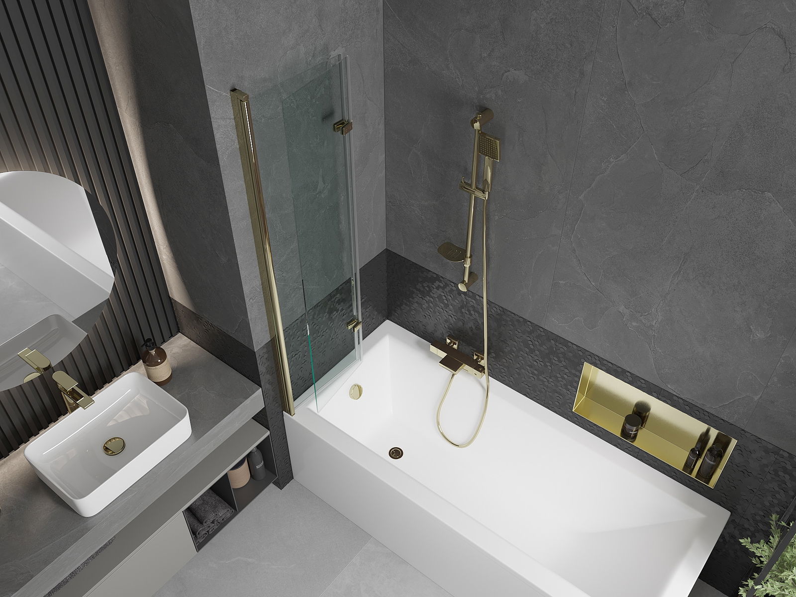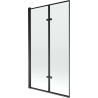 Un paravent composé de deux ailes repliables. Cette solution permet de gagner de la place dans la salle de bain et d'utiliser l'espace restant lorsque l'on ne se baigne pas.