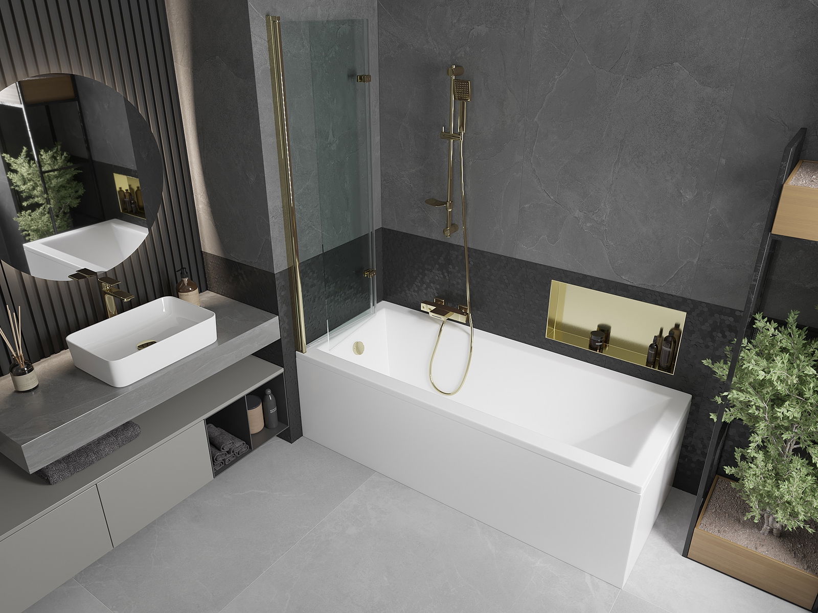 Un paravent composé de deux ailes repliables. Cette solution permet de gagner de la place dans la salle de bain et d'utiliser l'espace restant lorsque l'on ne se baigne pas.