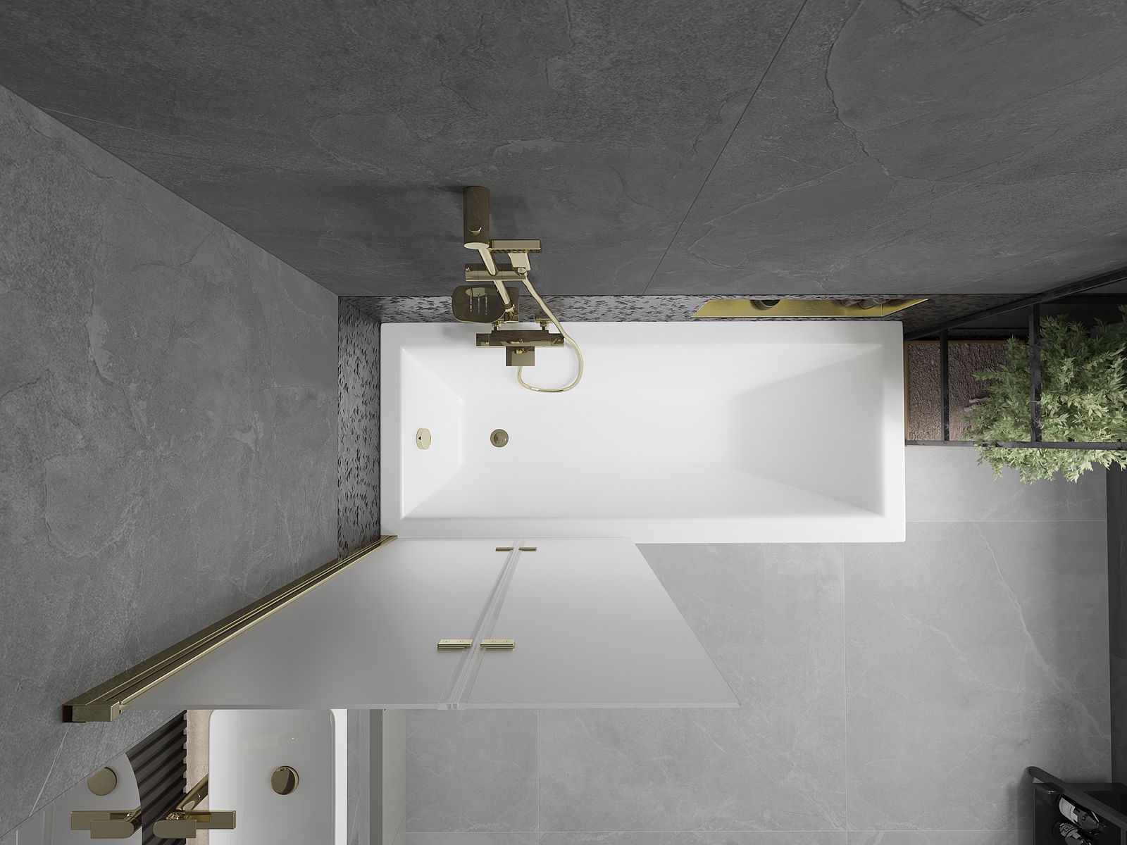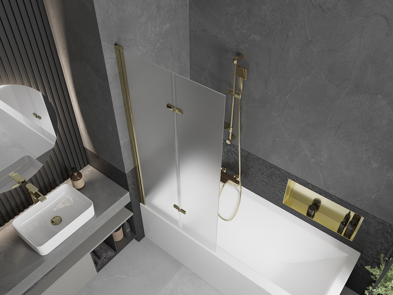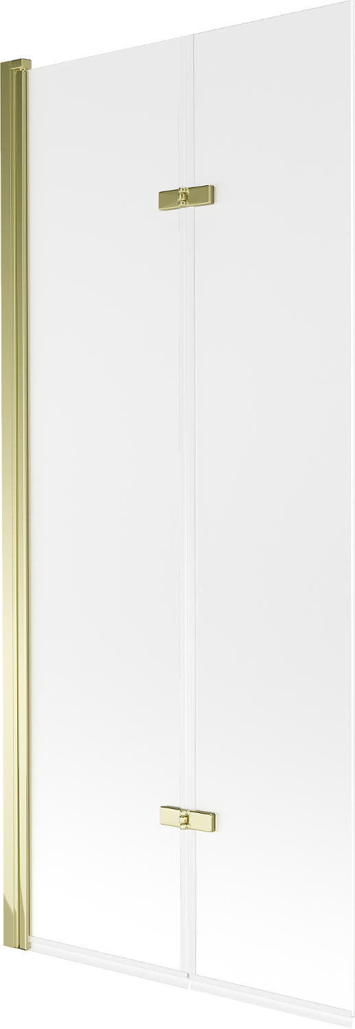 Un paravent composé de deux ailes repliables. Cette solution permet de gagner de la place dans la salle de bain et d'utiliser l'espace restant lorsque l'on ne se baigne pas.