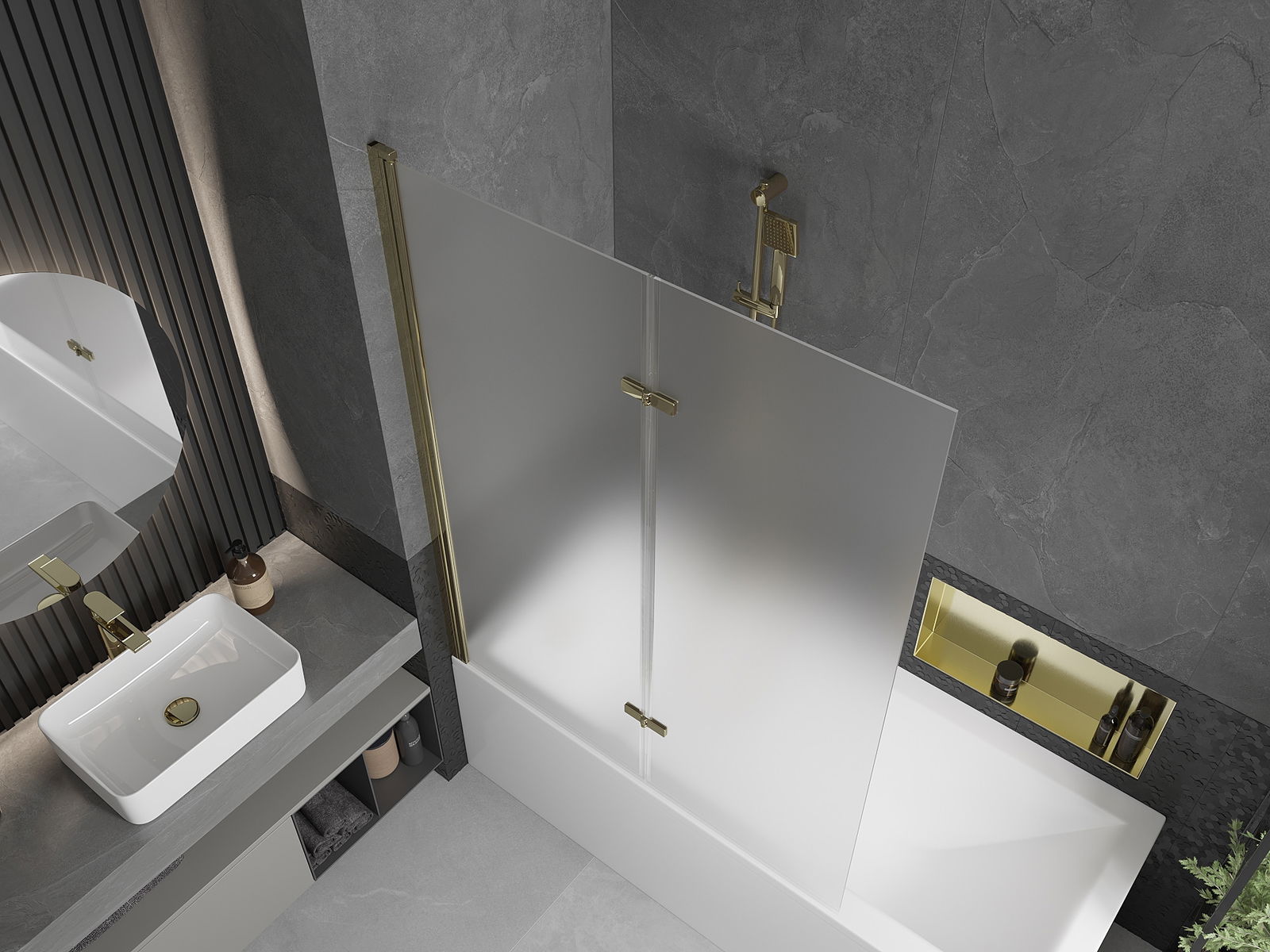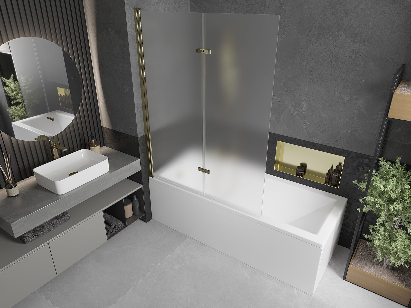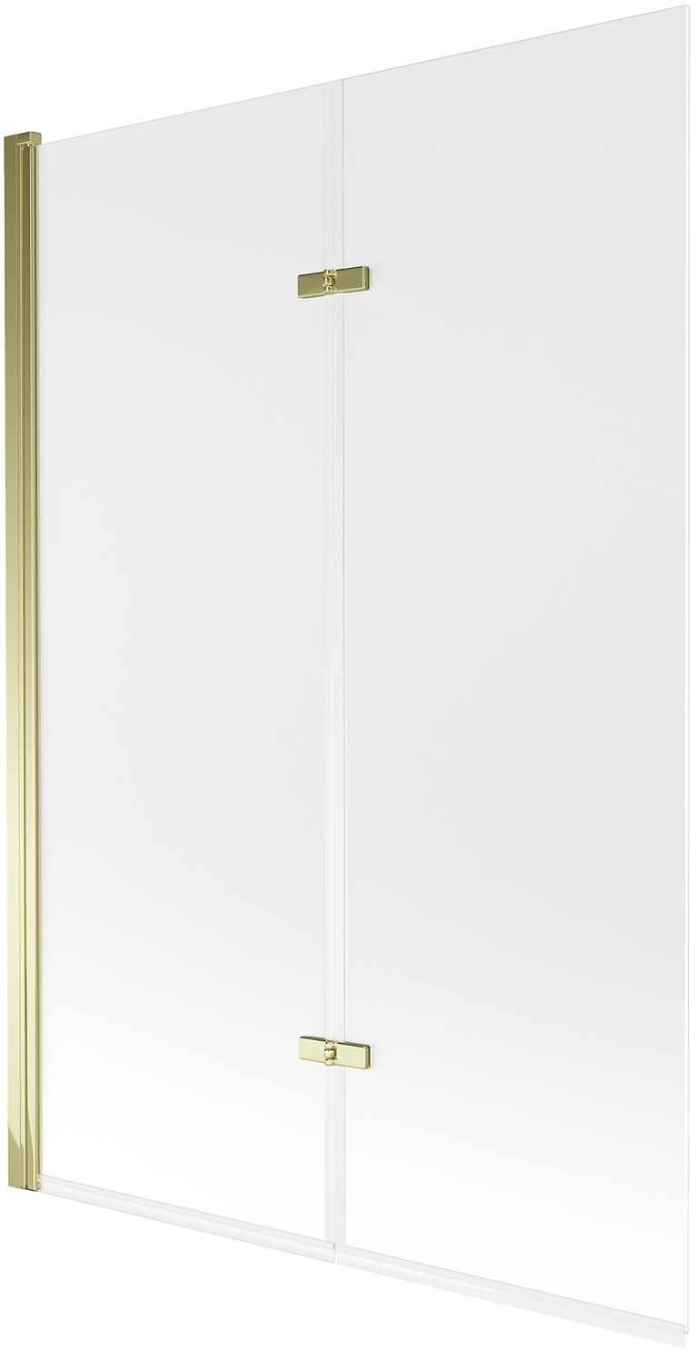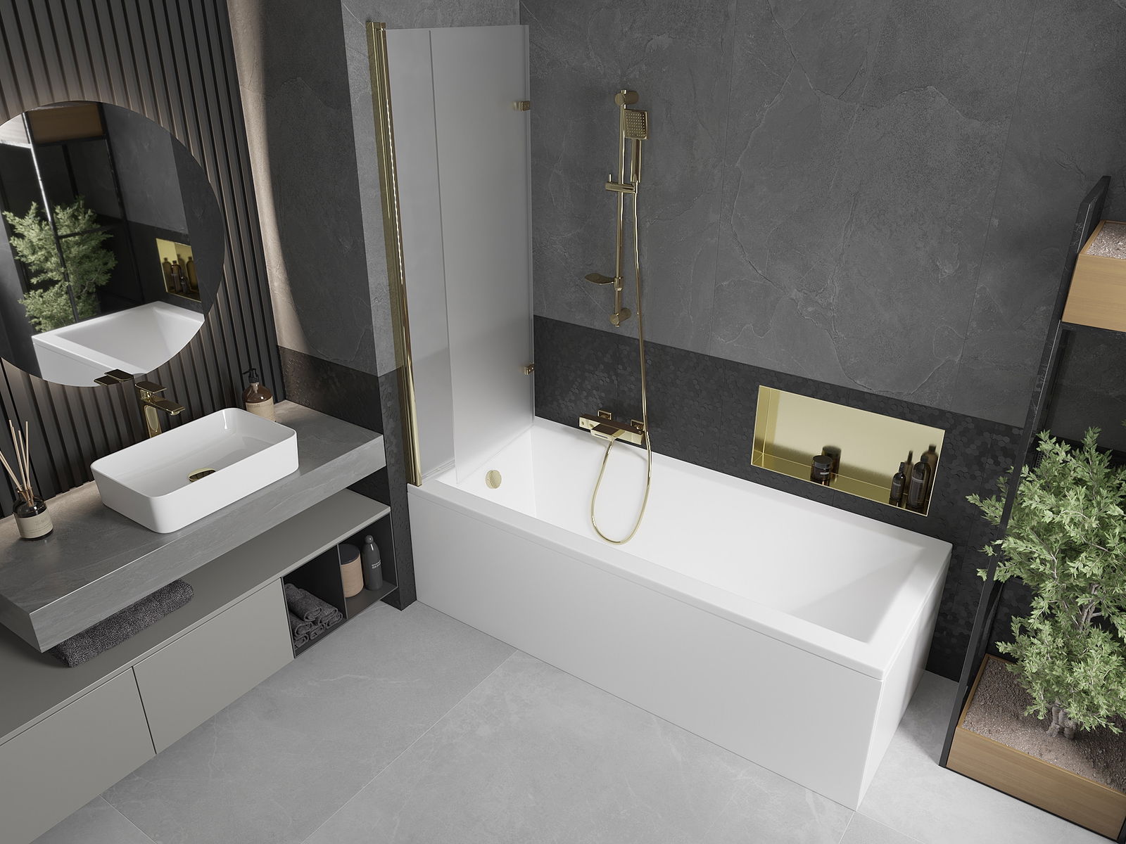 Un paravent composé de deux ailes repliables. Cette solution permet de gagner de la place dans la salle de bain et d'utiliser l'espace restant lorsque l'on ne se baigne pas.