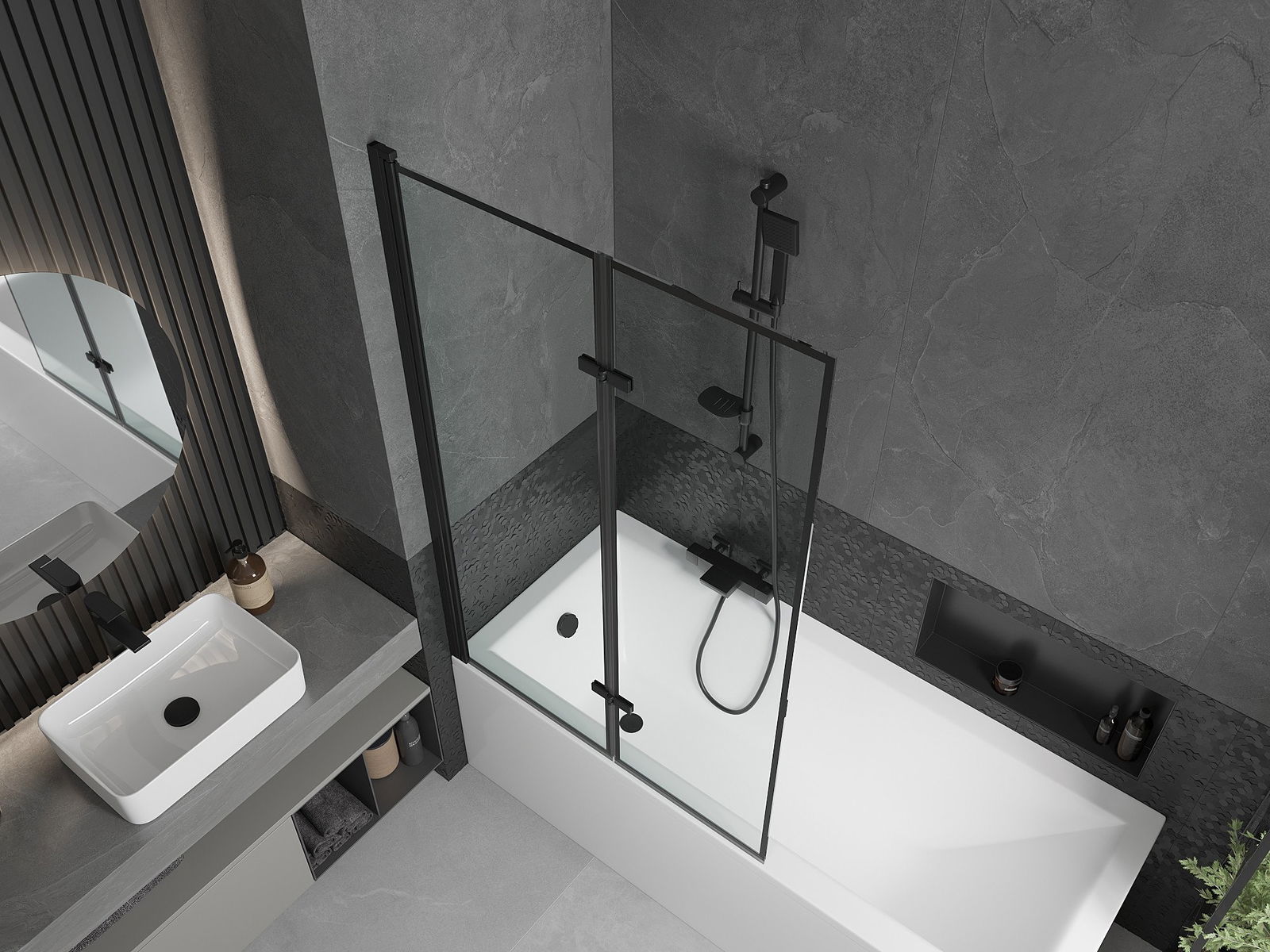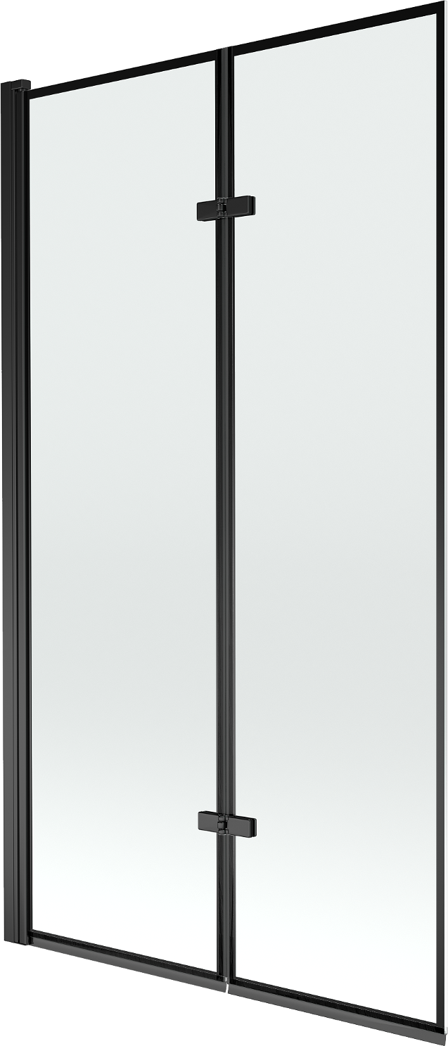 Un paravent composé de deux ailes repliables. Cette solution permet de gagner de la place dans la salle de bain et d'utiliser l'espace restant lorsque l'on ne se baigne pas.