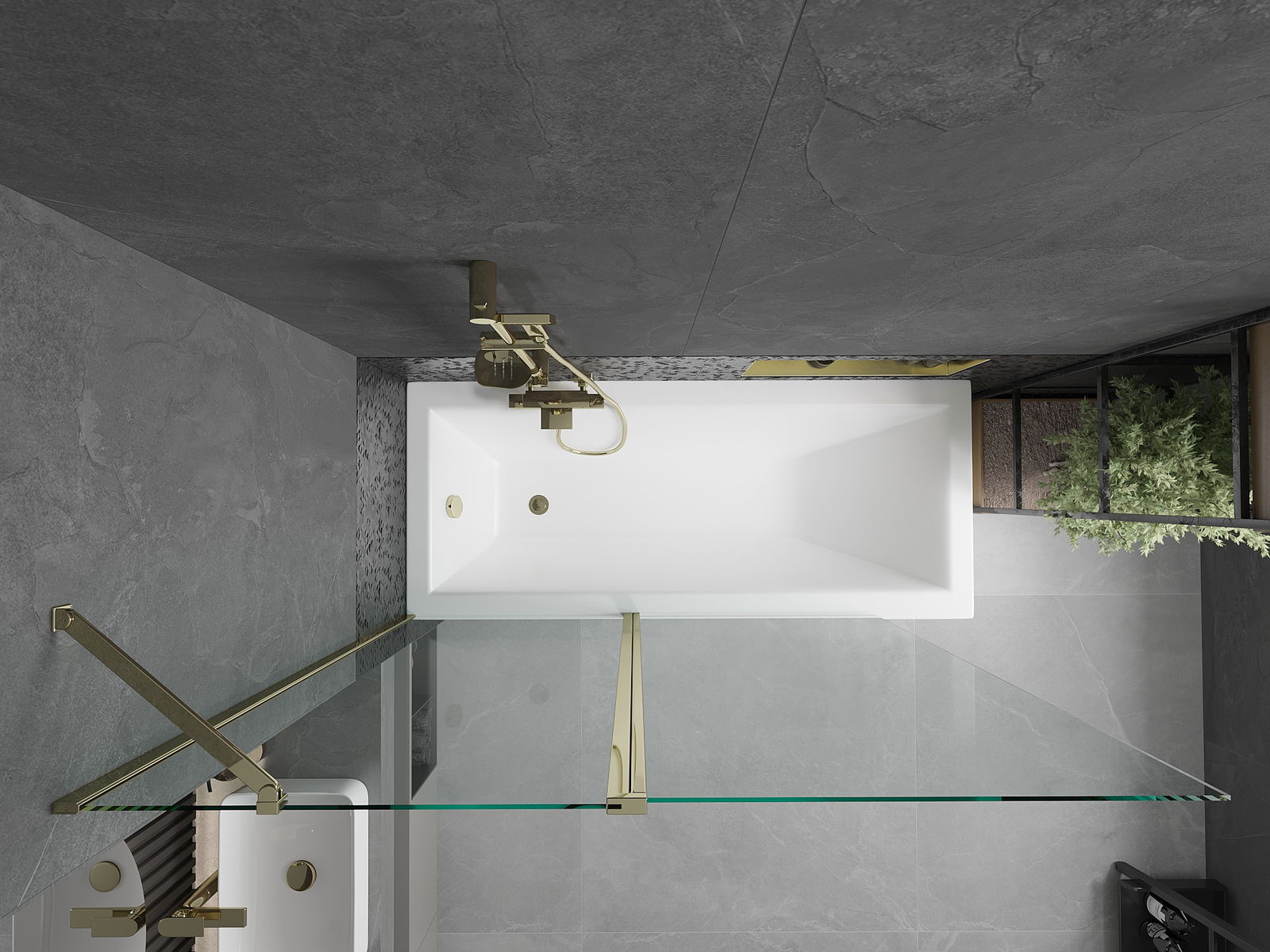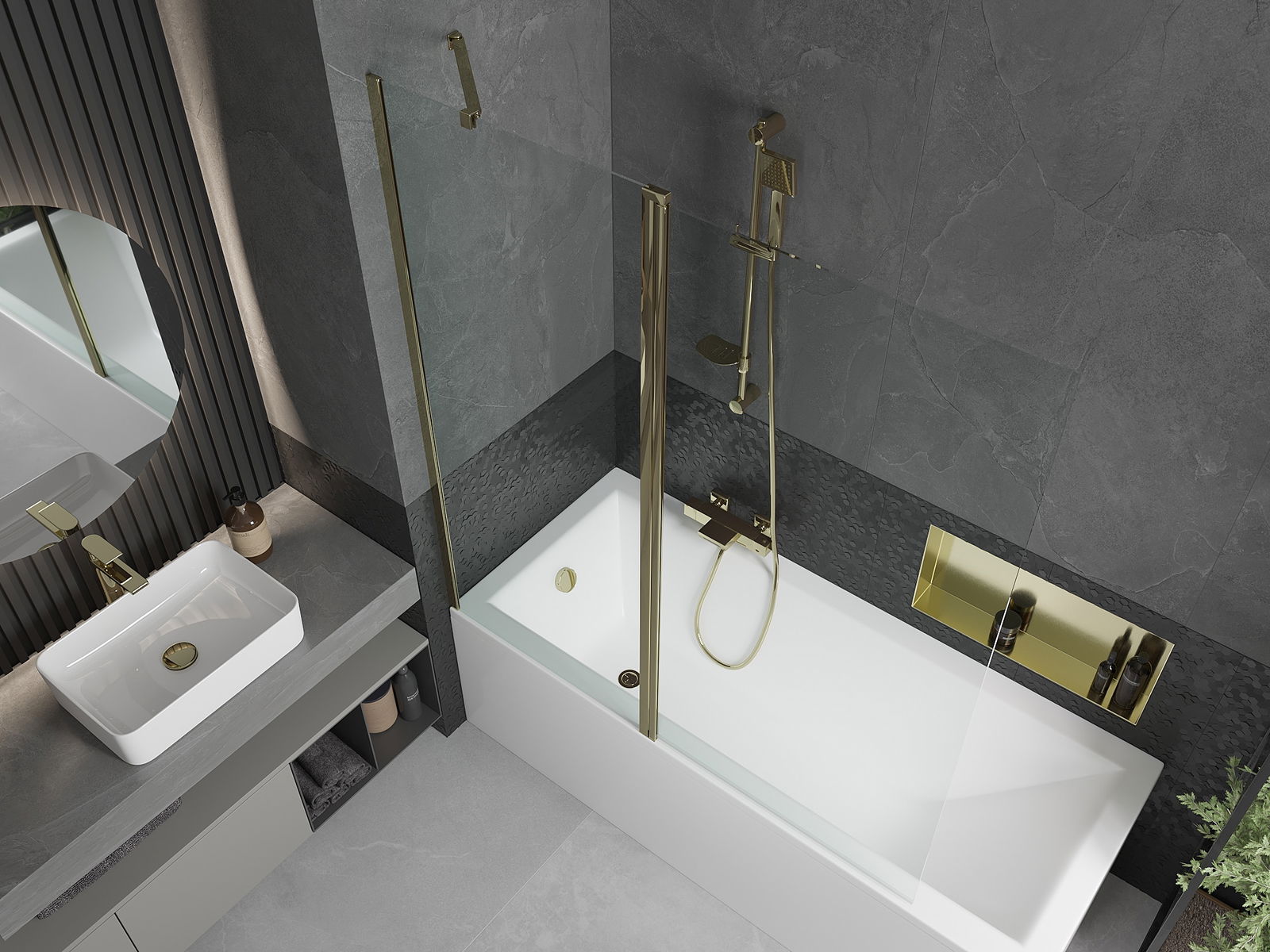 Le paravent est doté d'une aile mobile et pliable. Cette solution permet de gagner de la place dans la salle de bains et d'utiliser l'espace restant lorsque l'on ne se baigne pas.