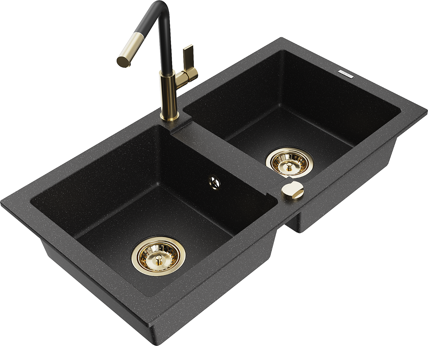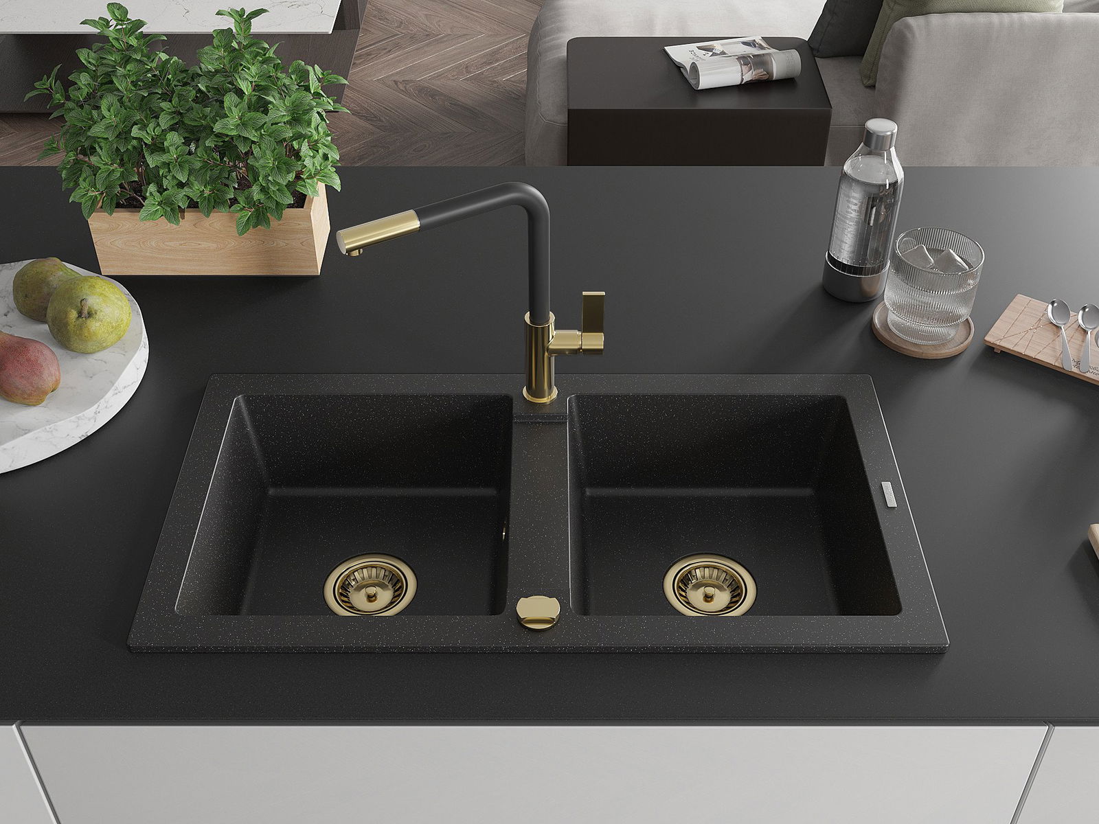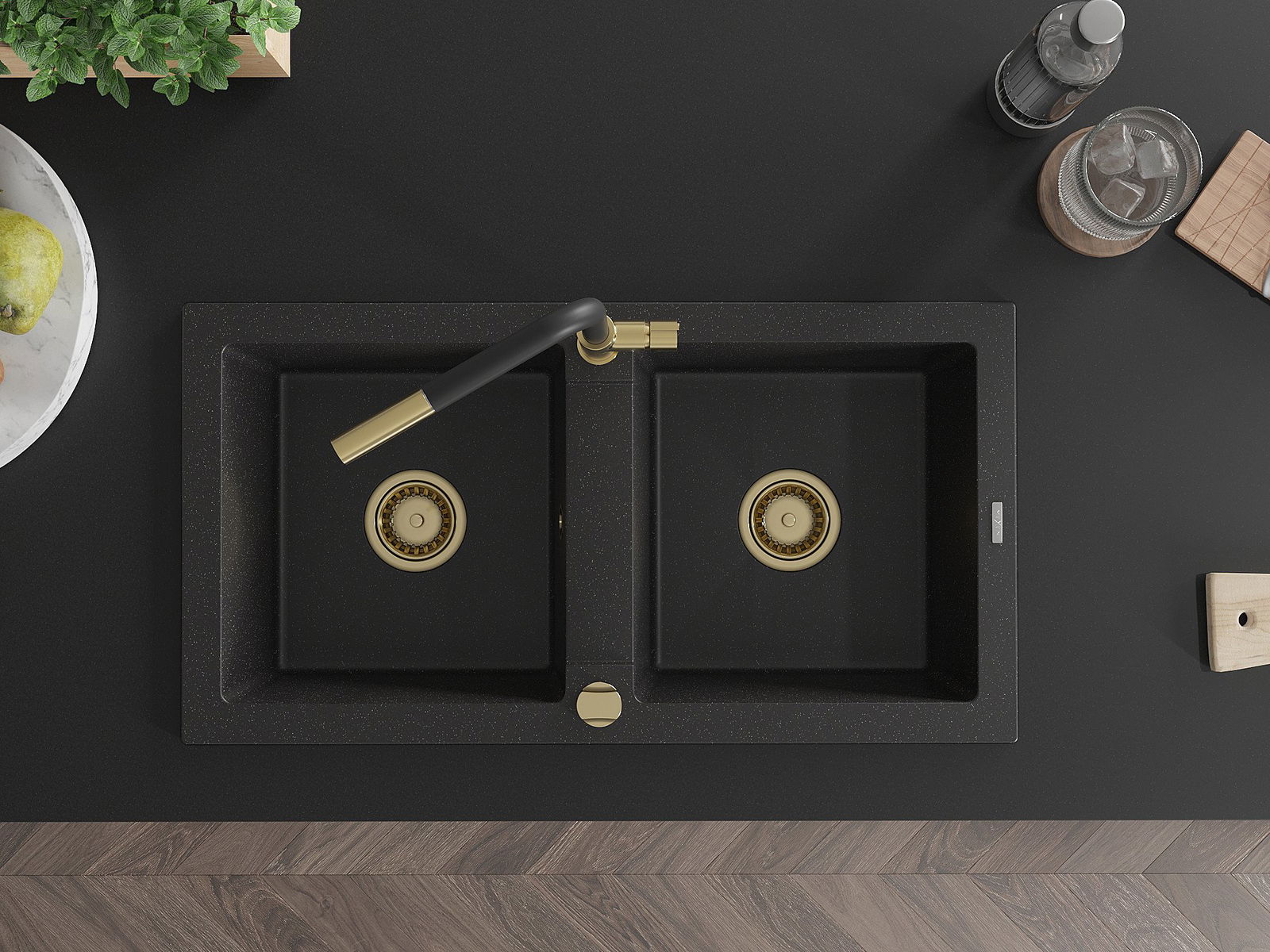 Mexen Mario évier en granit à 2 bacs avec robinet de cuisine Flora, noir/argent métallisé - 6504-73-670401-57-G