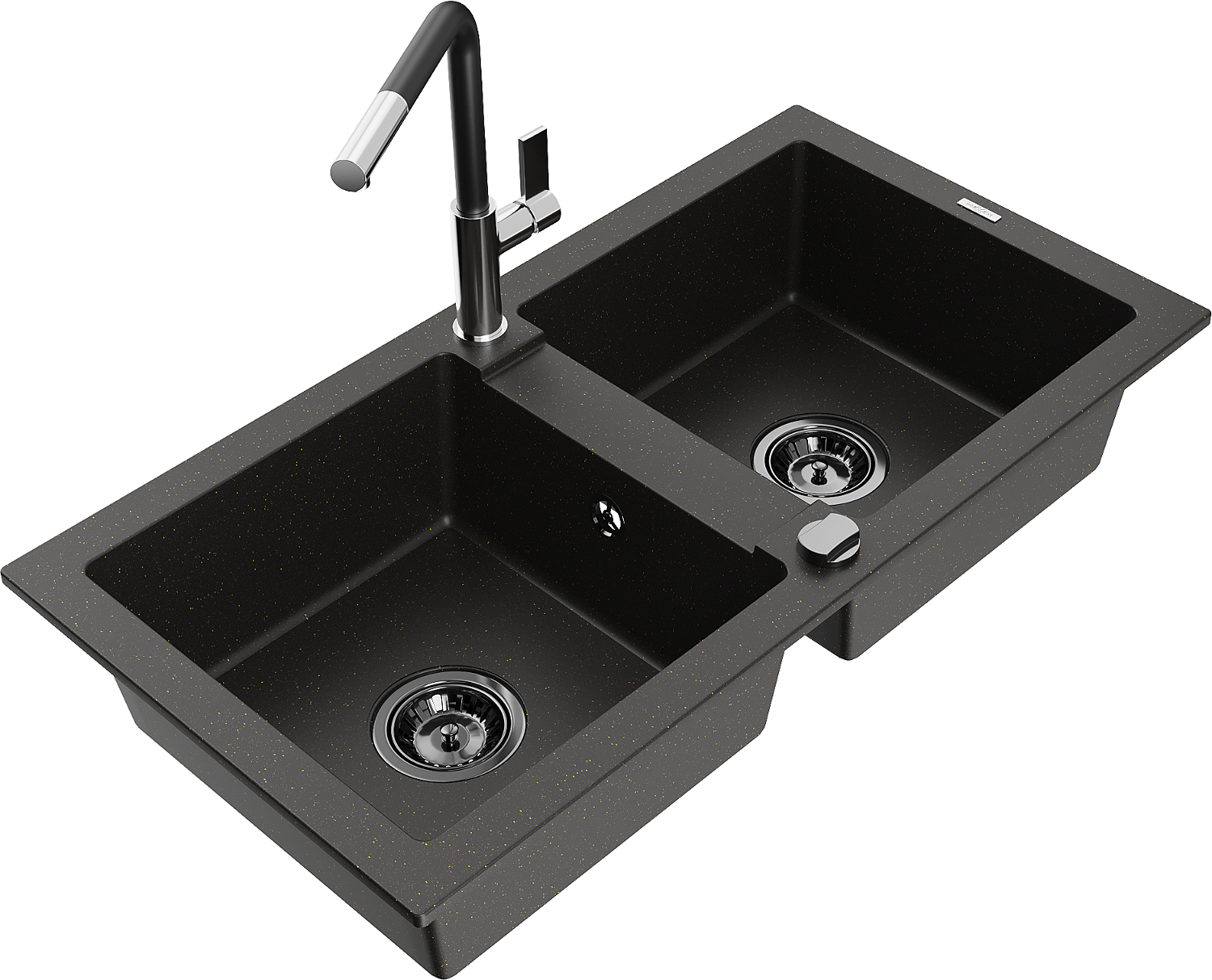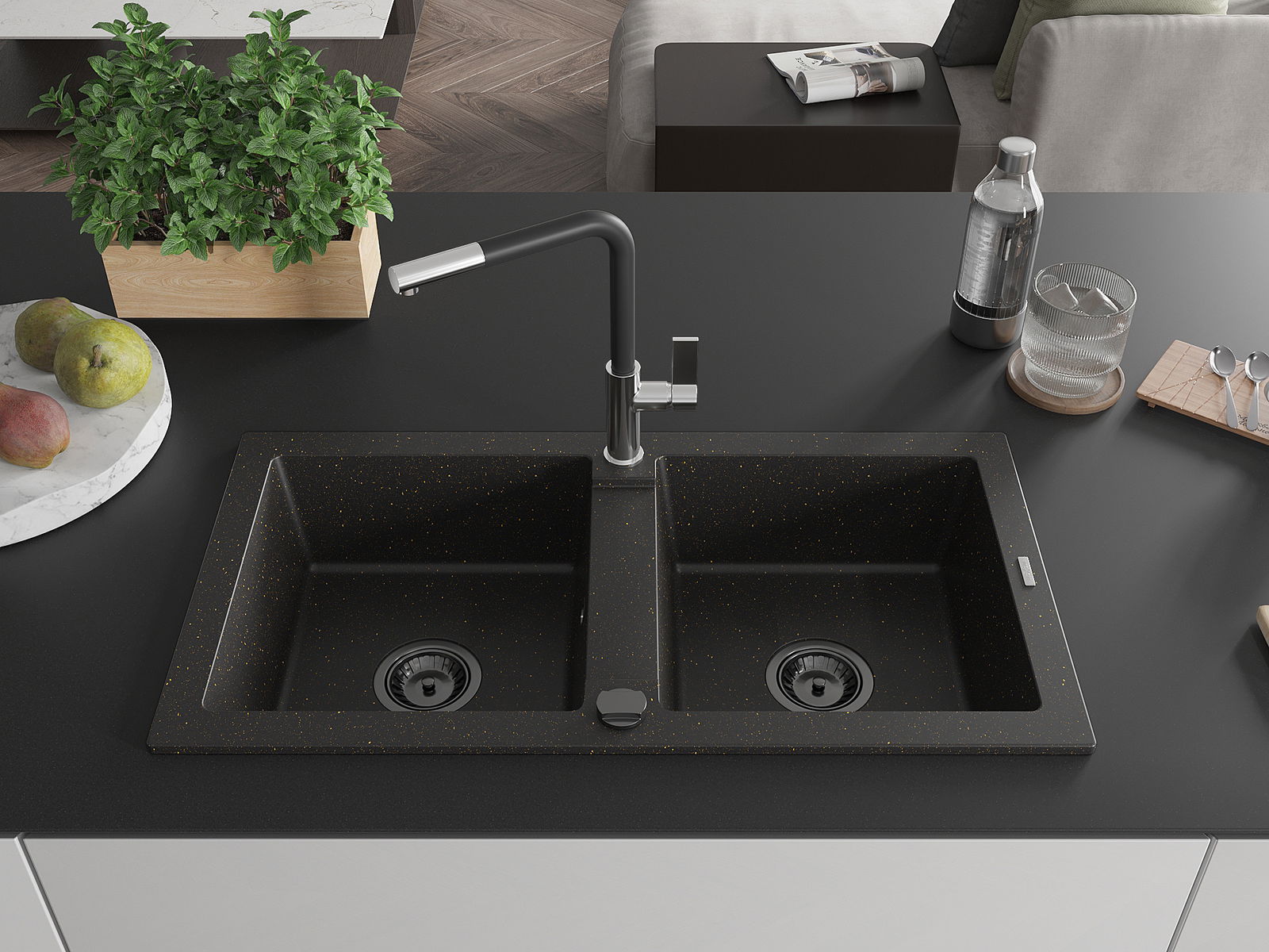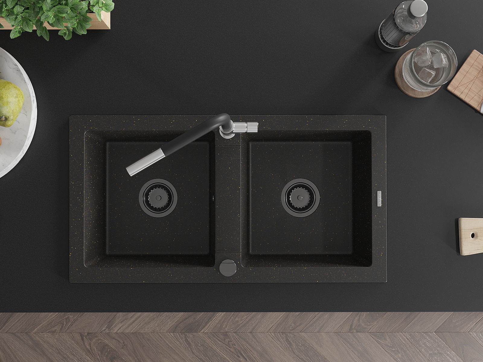 Mexen Mario évier en granit à 2 bacs avec robinet de cuisine Flora, noir/doré métallique - 6504-75-670401-07-B