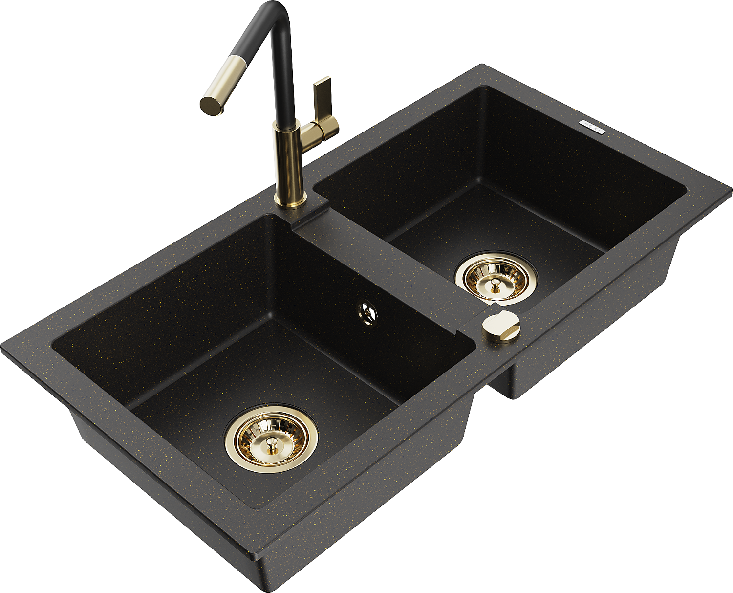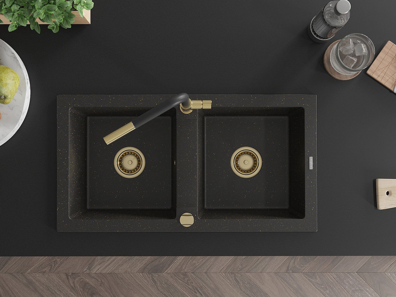 Mexen Mario évier en granit 2 cuves avec robinet de cuisine Flora, noir/doré métallique - 6504-75-670401-57-G