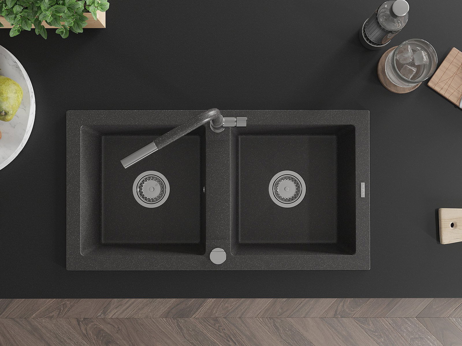 Mexen Mario évier en granit à 2 bacs avec robinet de cuisine Flora, noir moucheté - 6504-76-670401-08