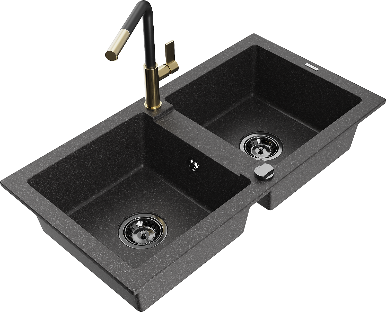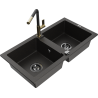 Mexen Mario évier en granit 2 bacs avec robinet de cuisine Flora, noir moucheté - 6504-76-670401-57-B