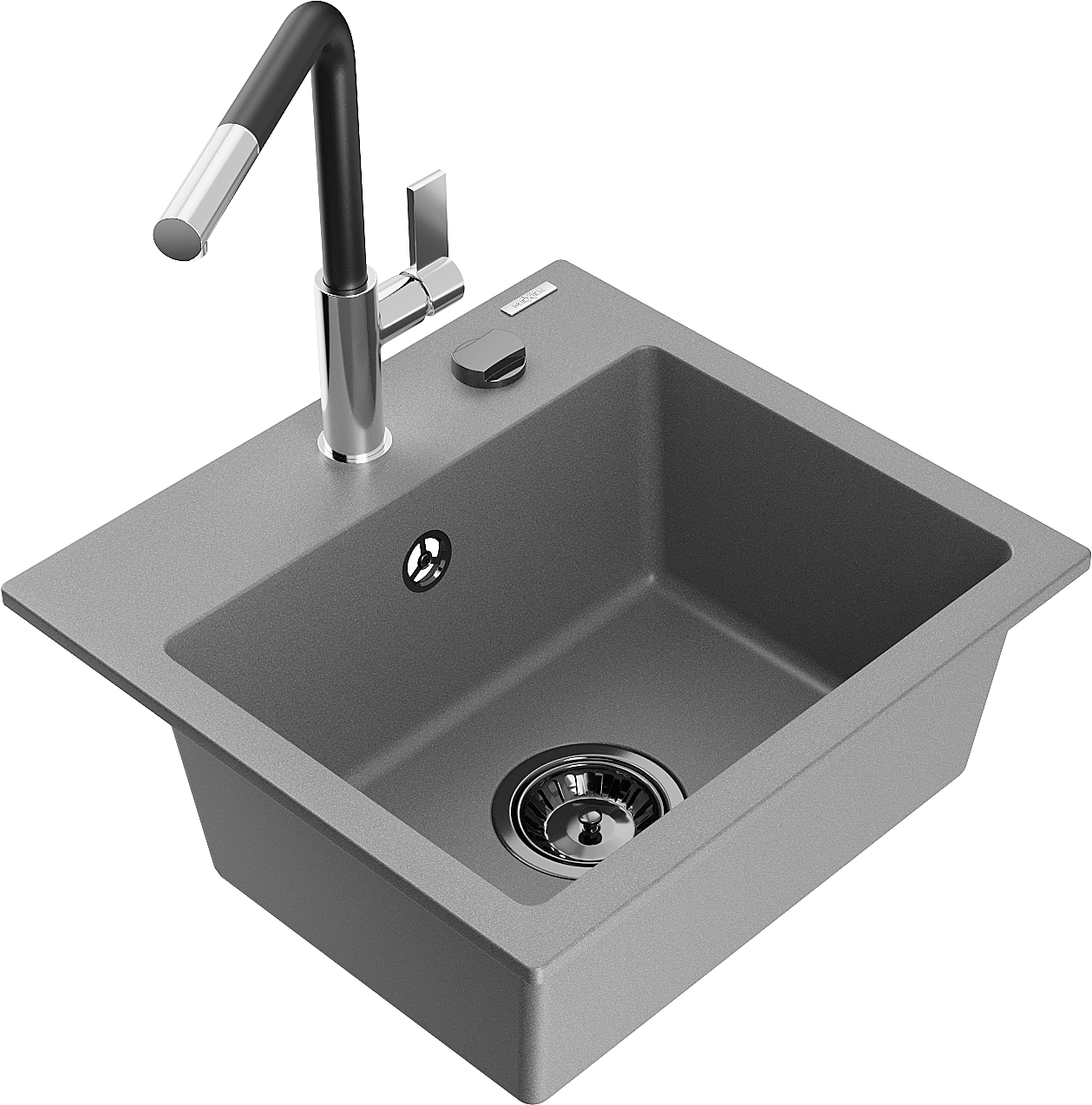 Mexen Milo évier en granit 1 bac avec robinet de cuisine Flora, gris - 6505-71-670401-07-B