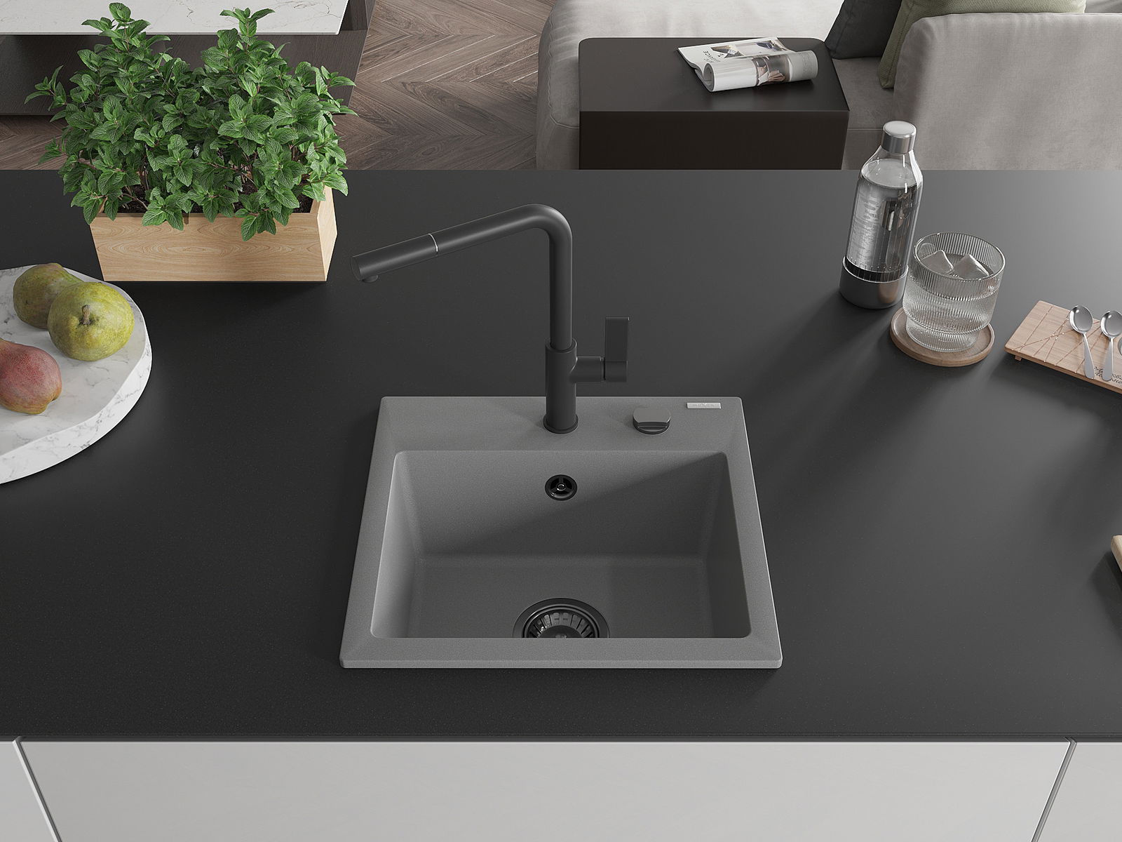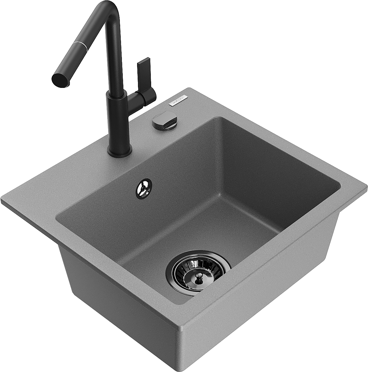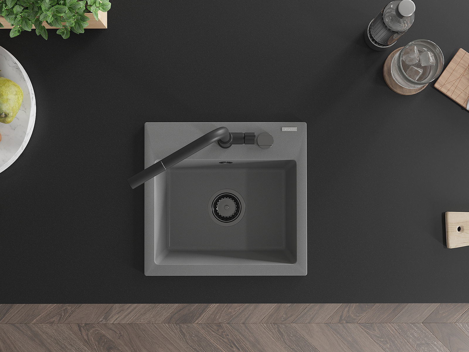 Mexen Milo évier en granit 1 bac avec robinet de cuisine Flora, gris - 6505-71-670401-70-B