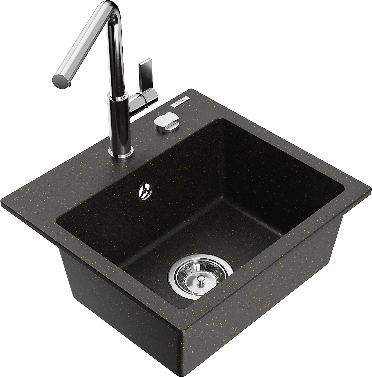 Mexen Milo évier en granit 1 bac avec robinet de cuisine Flora, noir/or métallique - 6505-75-670401-00