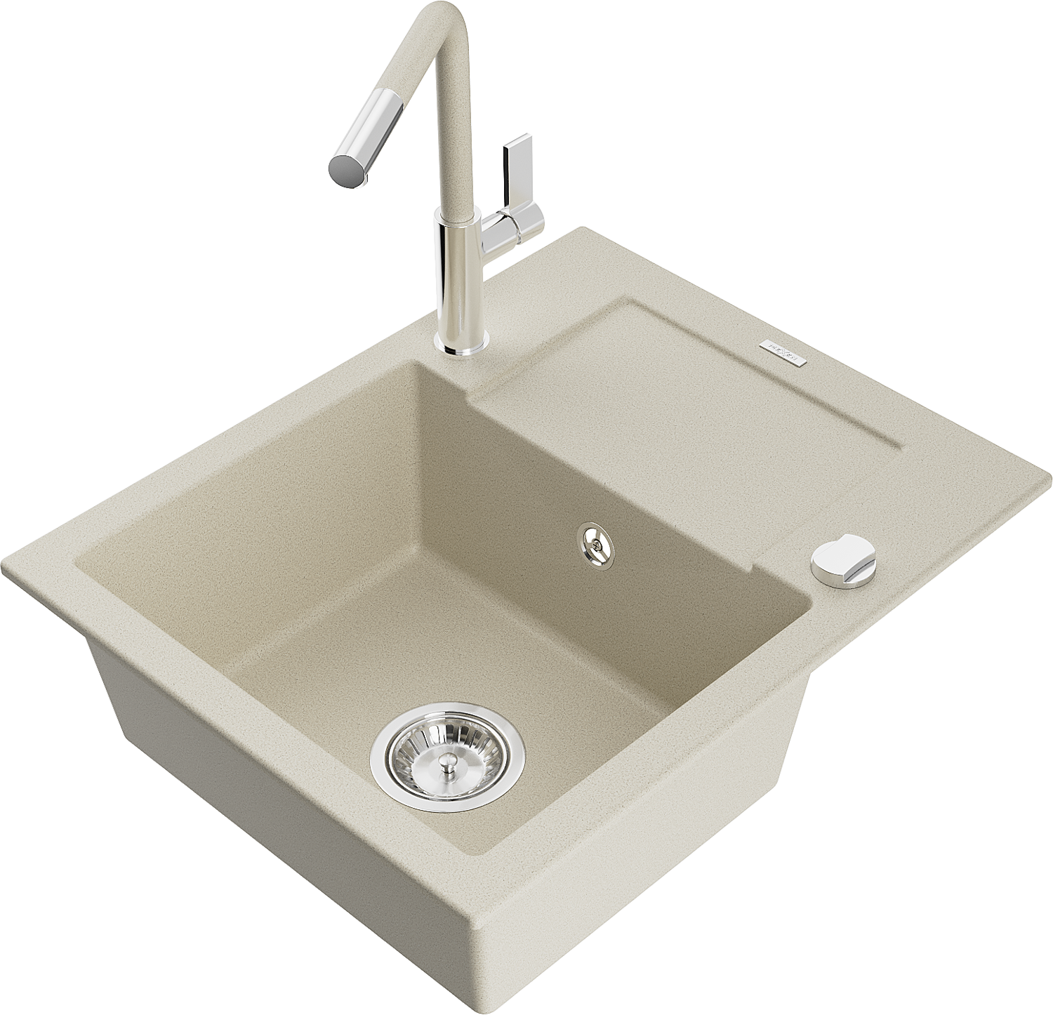 Mexen Enzo évier en granit 1 bac avec égouttoir et robinet de cuisine Flora, beige - 6506-69-670401-09