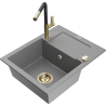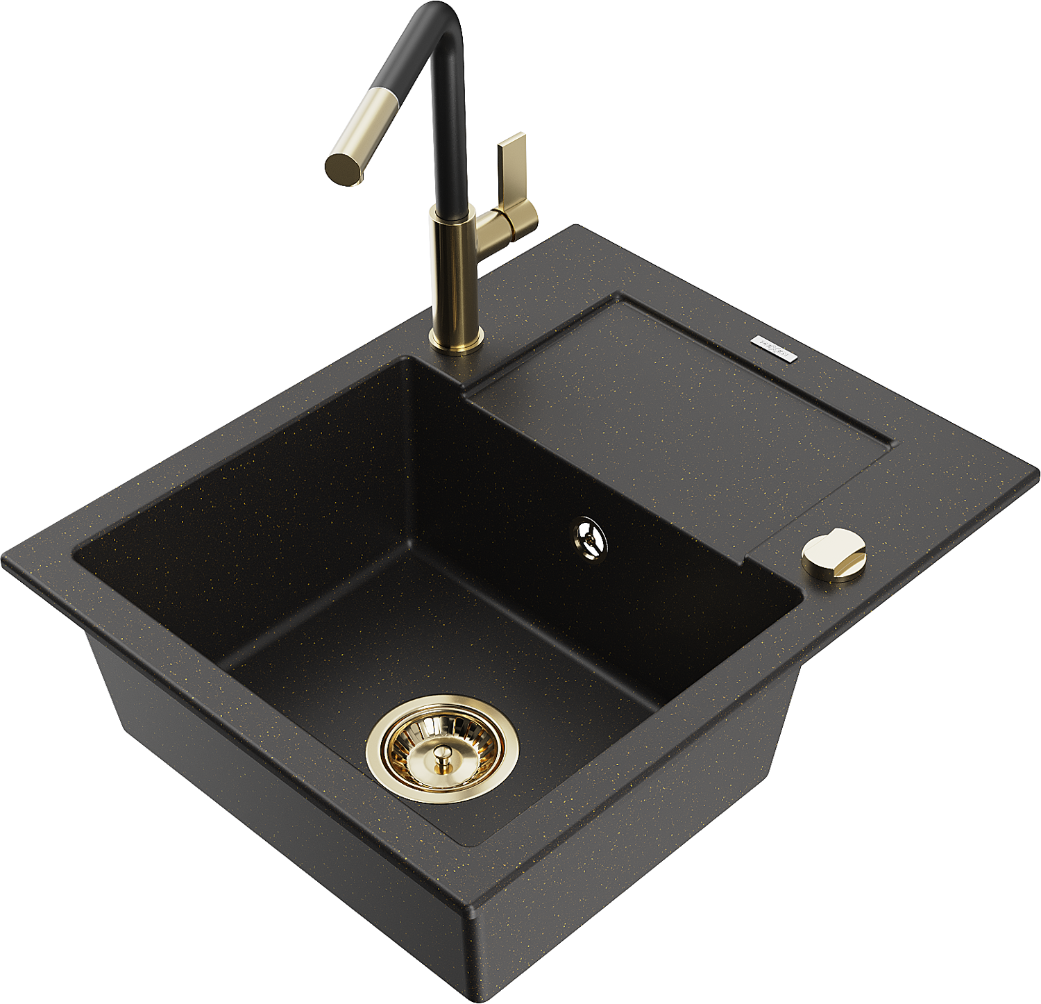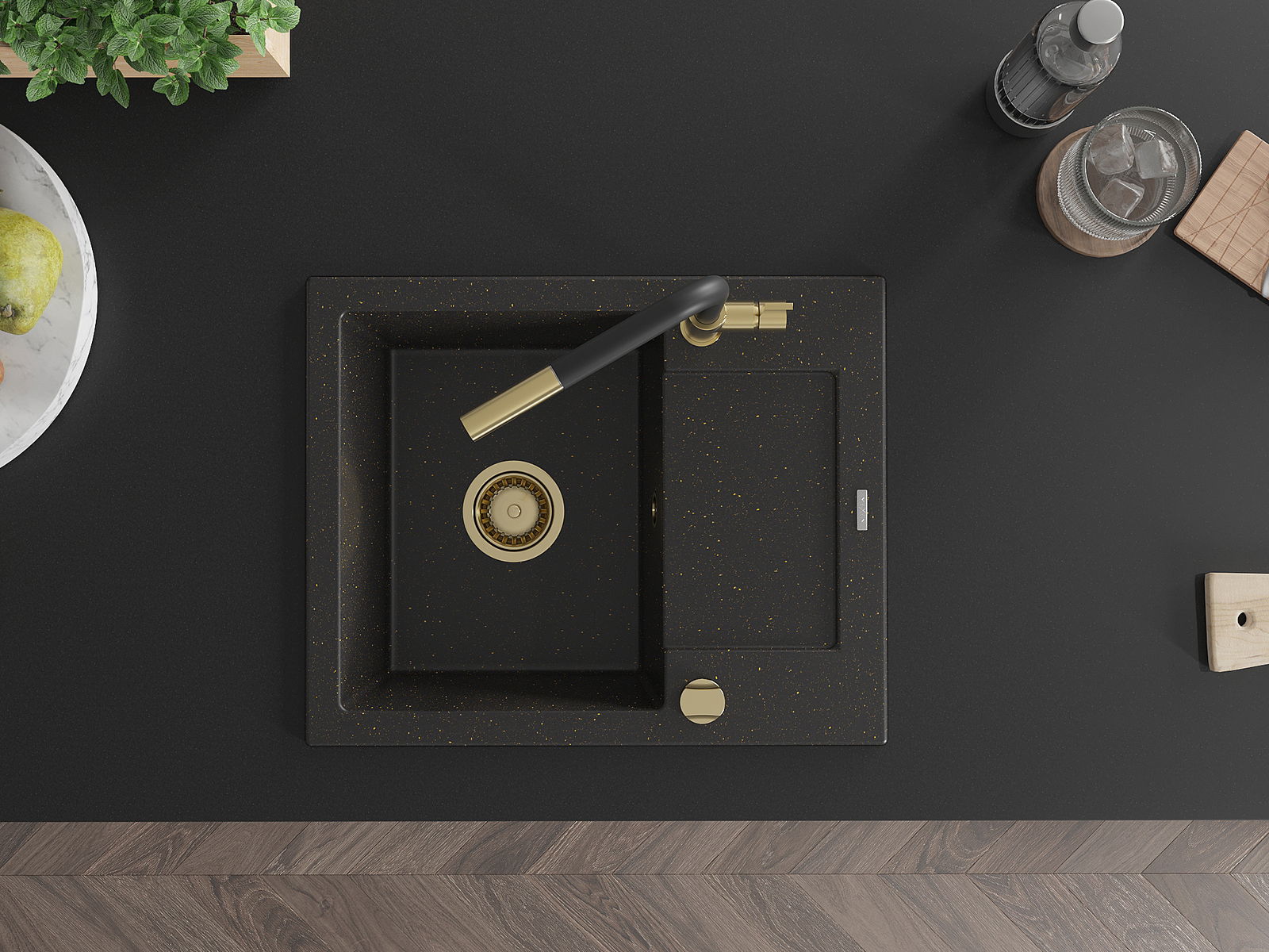 Mexen Enzo évier en granit 1 bac avec égouttoir et robinet de cuisine Flora, noir/or métallique - 6506-75-670401-57-G